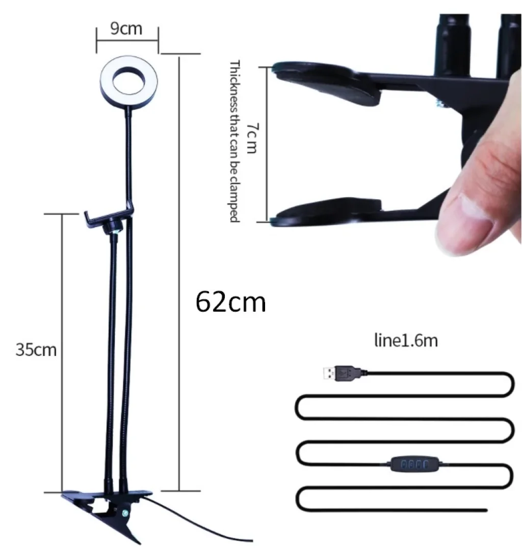 1. Esnek ve ayarlanabilir tutucu: 360 derece dönen telefon tutucu, fotoğraf çekimi veya video çekimi için istediğiniz gibi herhangi bir açıya ayarlamak için çekinmeyin. 2. ayarlanabilir parlaklık ve 3 renk LED ışık: 10 ayarlanabilir parlaklık ile led ışık tasarım farklı durumlarda tüm ihtiyaçlarınızı karşılar. Fotoğraf çekmek, video çekmek, kitap okumak ve canlı akış yapmak için ekstra ışığa ihtiyacınız olduğunda kullanışlı olacaktır! 3. USB POWERED LED ışık: USB portu birden fazla cihazla çalışır. Herhangi bir zamanda lamba ve cep telefonu tutucunun tadını özgürce çıkarabileceksiniz. 4. Sağlam klips tutucu: güçlü ısırma kuvveti ile özellikli metalden yapılmıştır. Sabit bölümün genişliği 0 ila 2.75 inç (7cm) arasında ayarlanabilir. Farklı kalınlıktaki çoğu masa ve masa ile uyumludur.