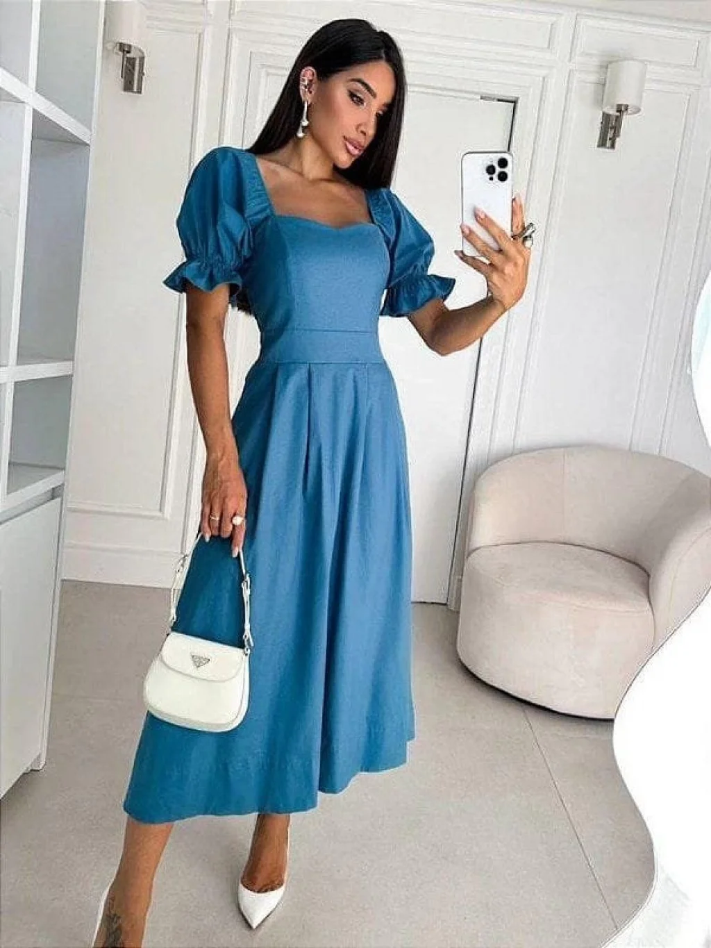 Kadın Kısa Kollu Kare Yaka Midi Boy Trikoton Kumaş Elbise