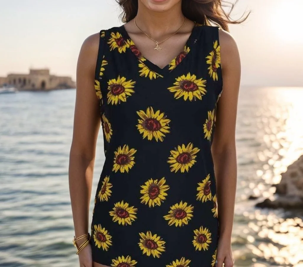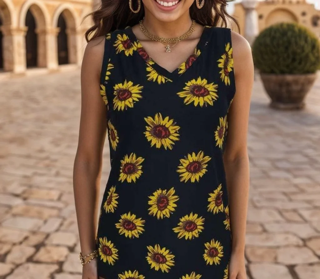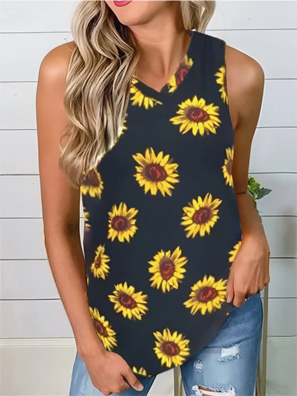 Kadın V Yaka Kolsuz Ayçiçeği Desen Krep Bluz