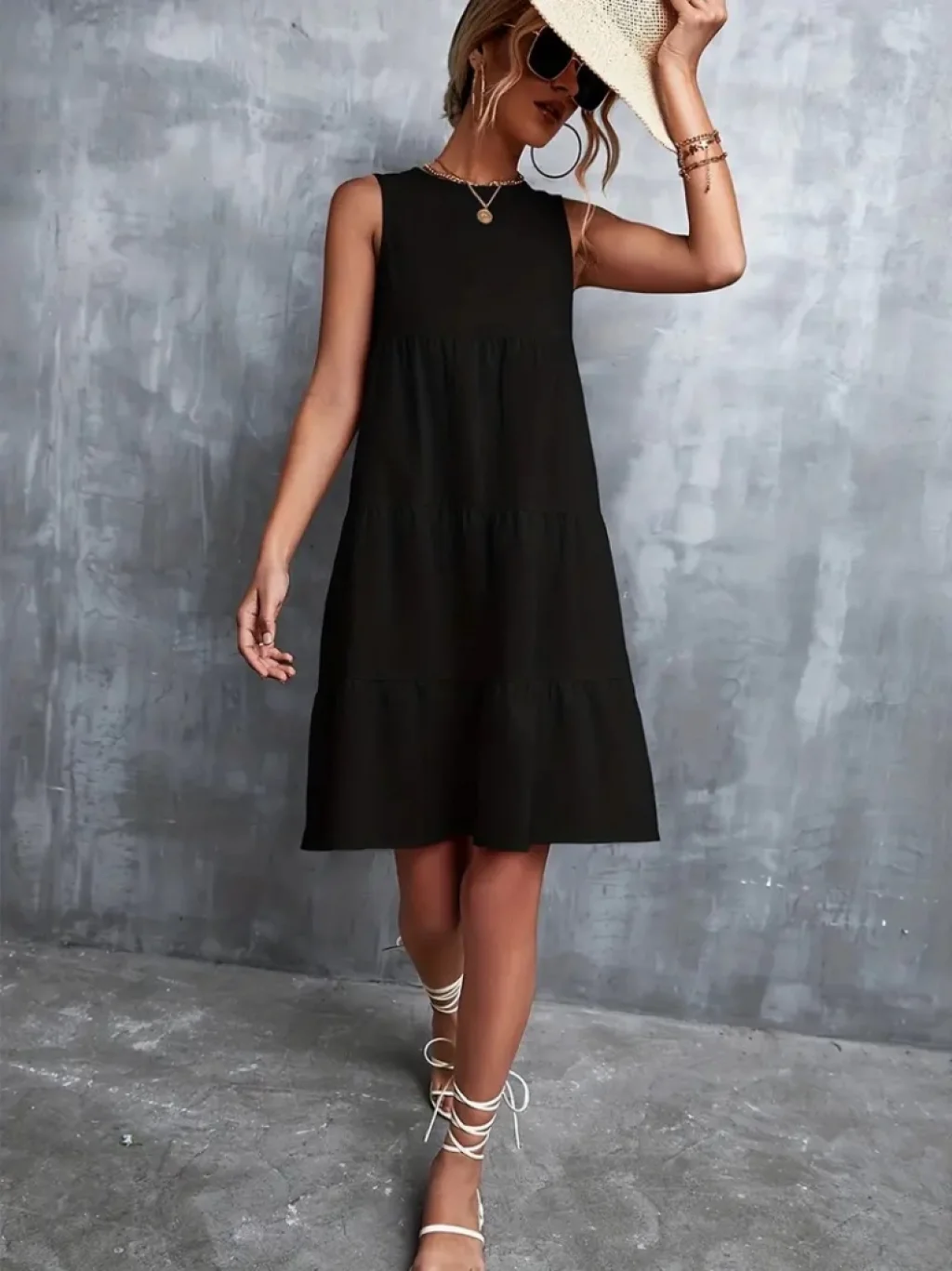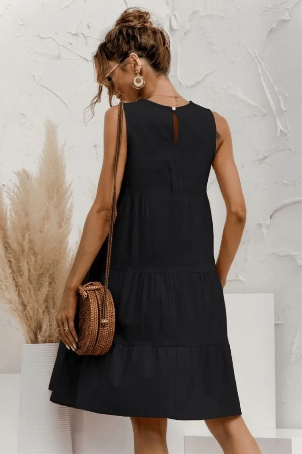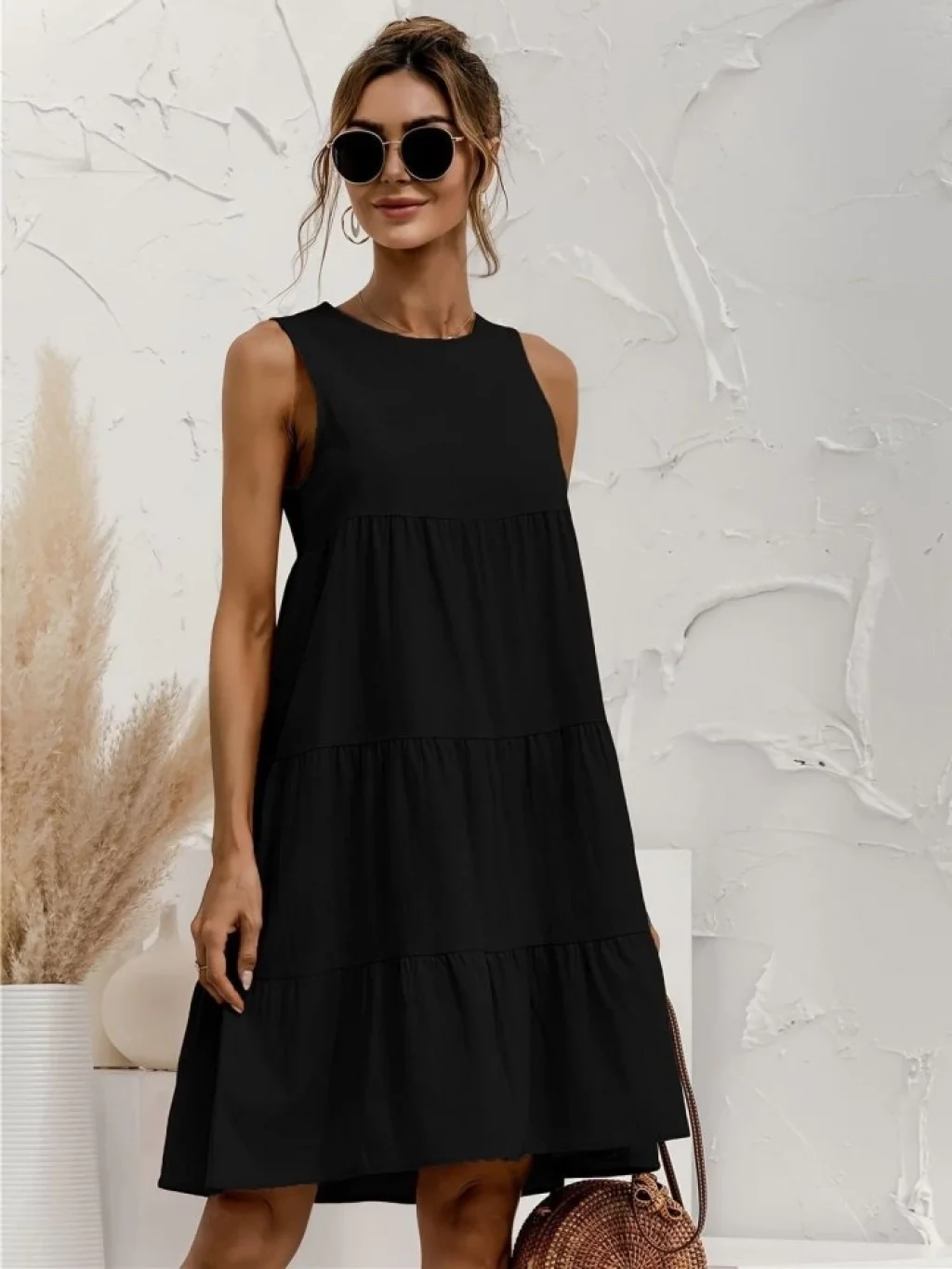 Kadın Uzun Kollu Yuvarlak Yaka Pileli Salaş Mini Ithal Krep Elbise