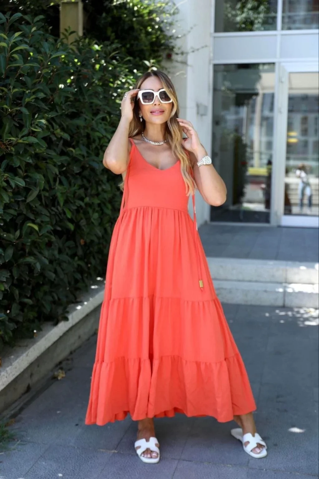 Kadın Keten Kumaş Askılı Ve Volanlı Midi Boy Elbise