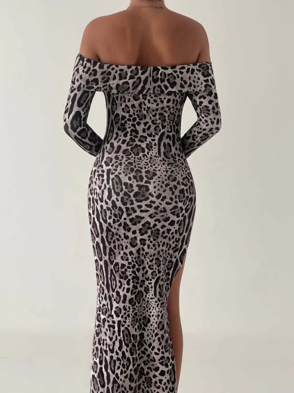Kadın Madonna Yaka Dalgıç Kumaş Leopar Desen Maxi Boy Derin Yırtmaçlı Elbise