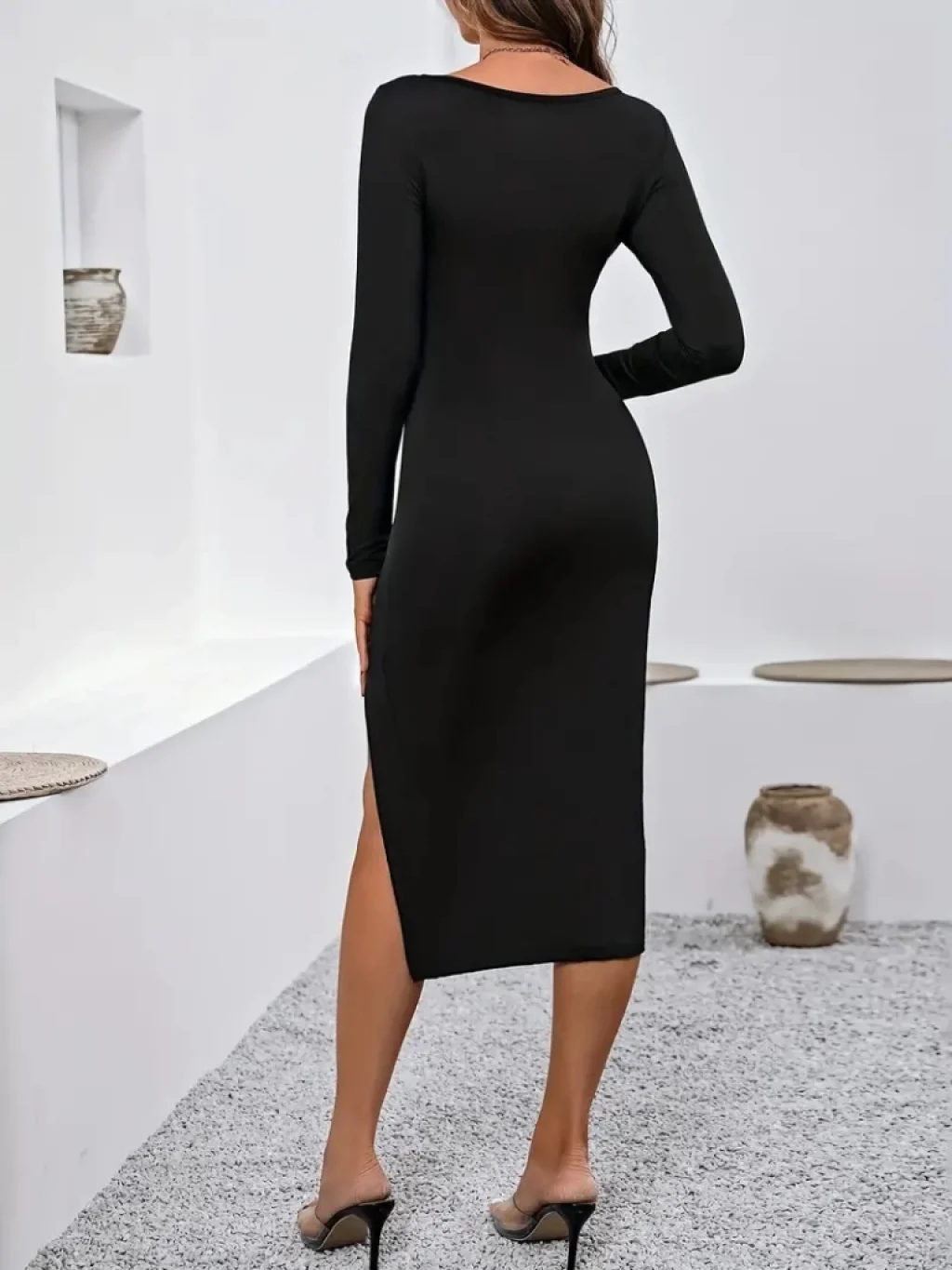 Kadın Uzun Kollu Bisiklet Yaka Yandan Yırtmaçlı Midi Triko Elbise