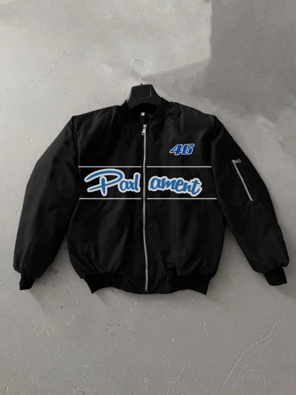 Tam Fermuarlı Uzun Kol Baskılı Bomber Ceket - Siyah