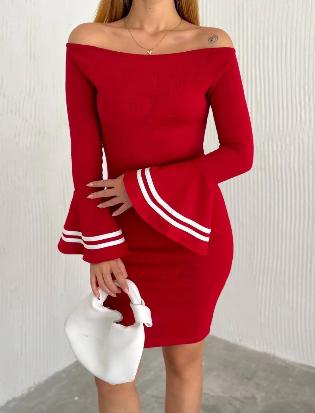 Kadın Akrilik Kumaş Ispanyol Kol Madonna Yaka Mini Elbise
