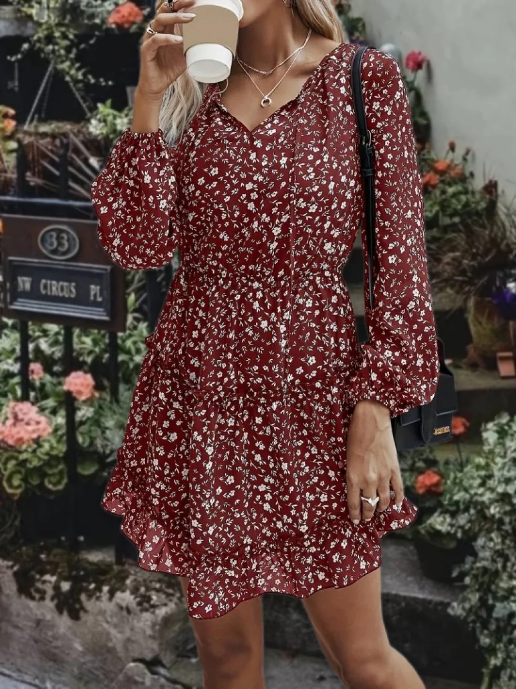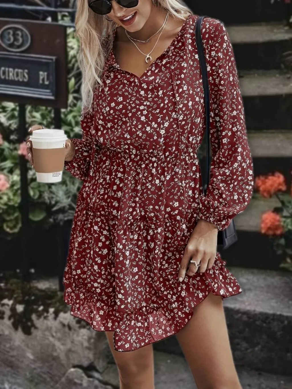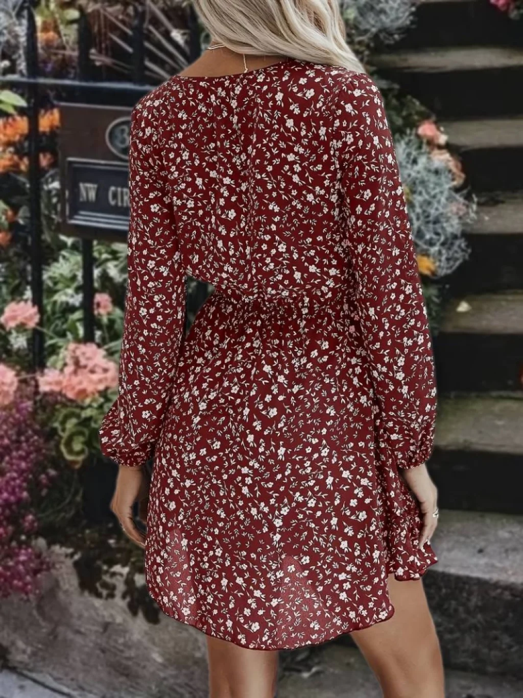 Kadın Uzun Kollu V Yaka Bağcıklı Belden Gipeli çiçek Baskılı Kısa Süprem Elbise