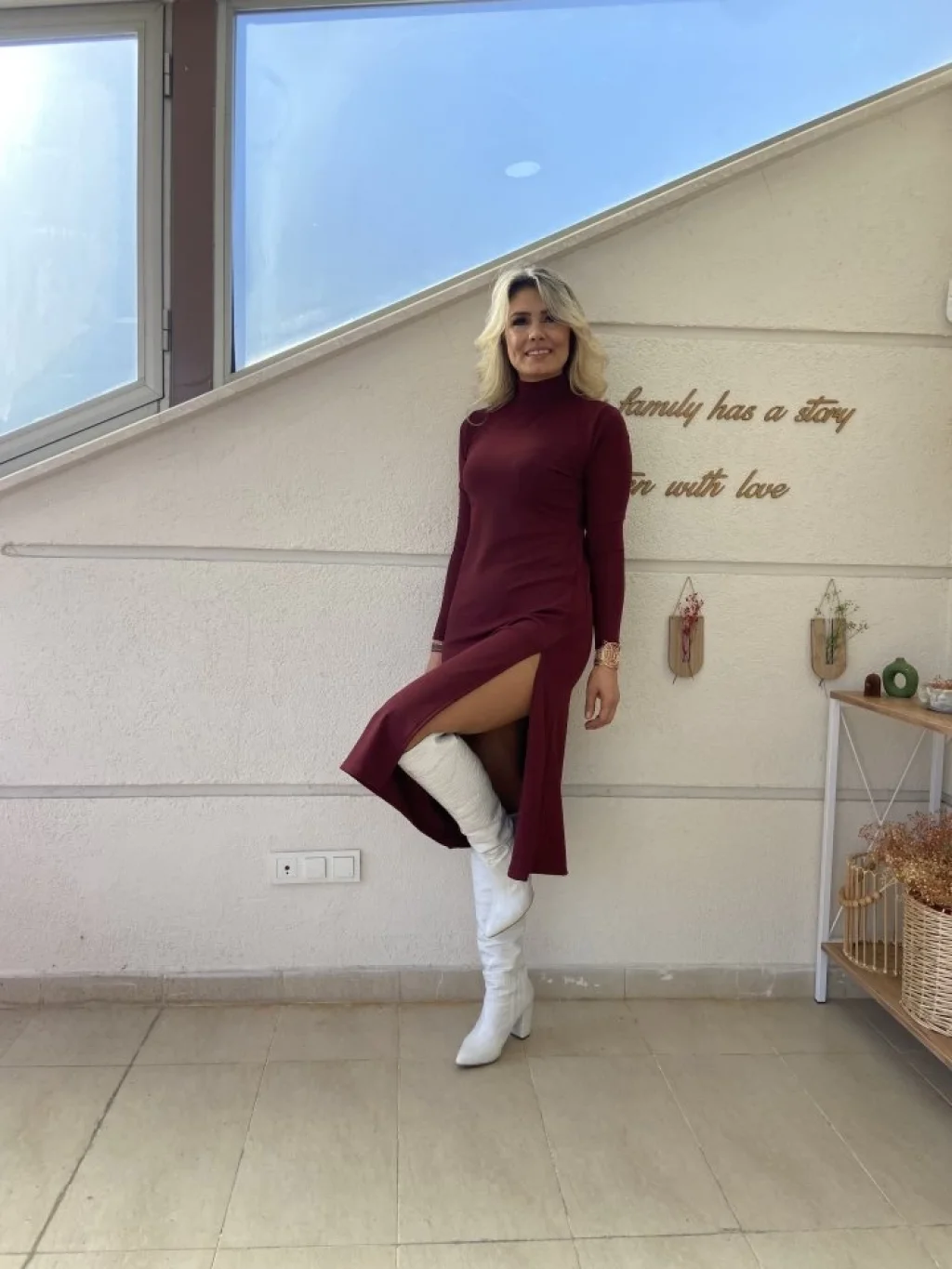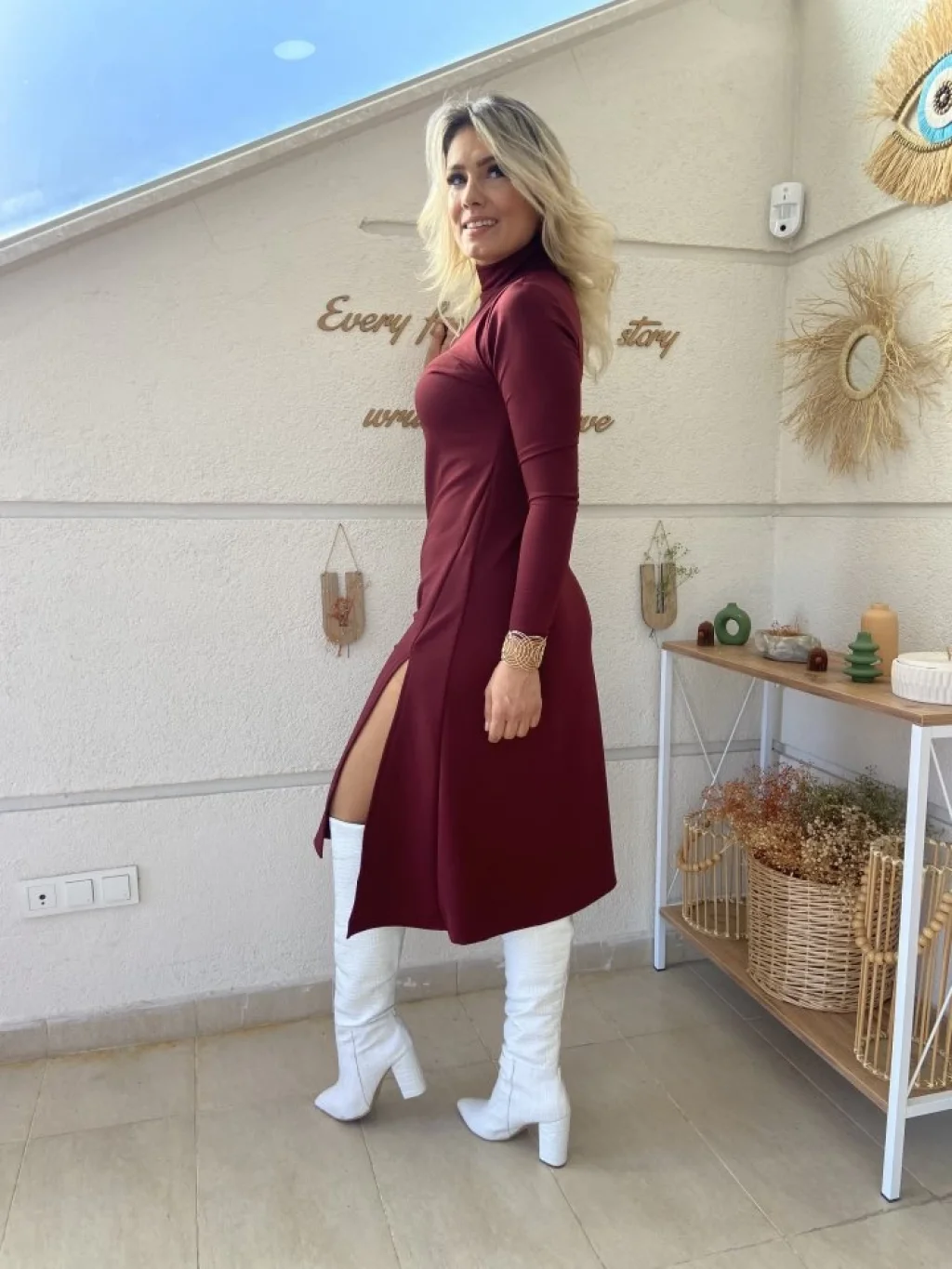Kadın Uzun Kollu Bisiklet Yaka Yandan Yırtmaçlı Midi Triko Elbise
