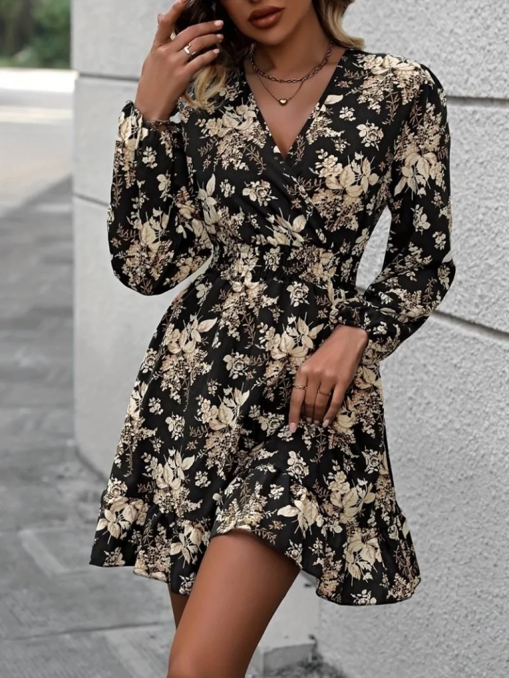 Kadın Uzun Kollu Kruvaze Yaka Beli Gipeli çiçek Desenli Kısa Dalgıç Elbise