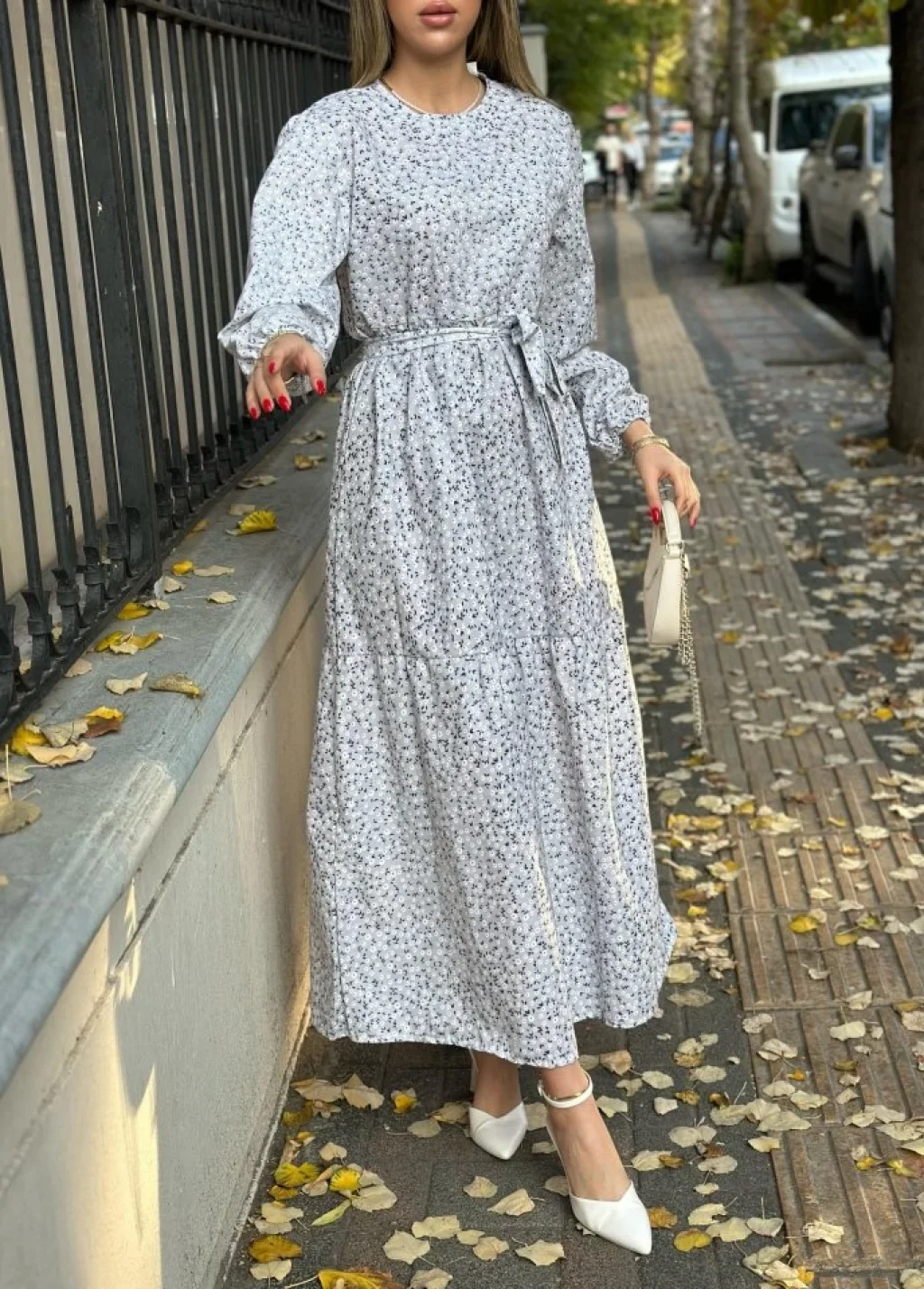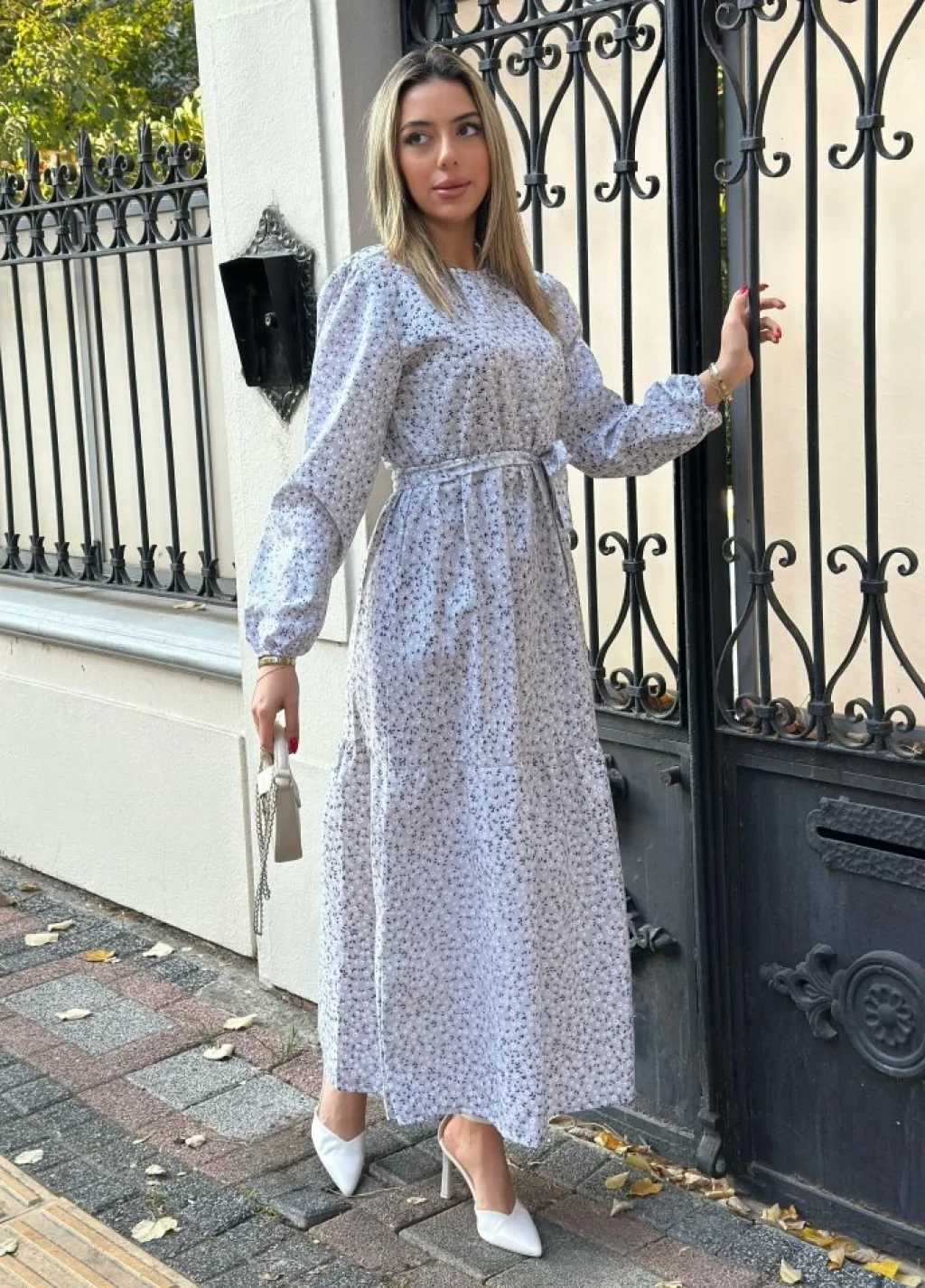 Kadın Uzun Kollu Bisiklet Yaka Papatya Desen Kuşak Dahil Maxi Boy Elbise