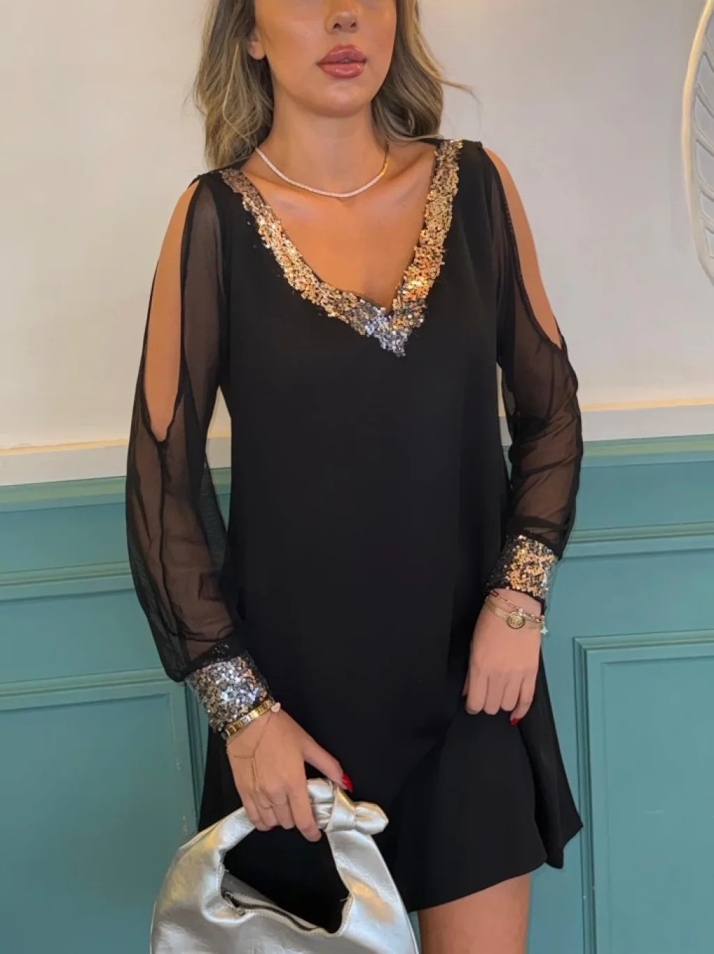 Kadın Siyah Uzun Kollu Kollar Tül Yırtmaçlı V Yakalı Kısa Krep Elbise