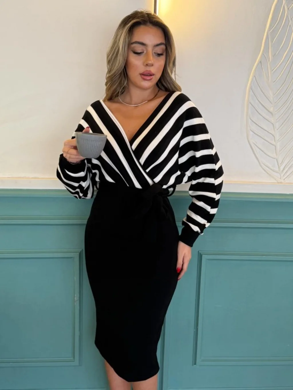 Uzun Kollu Kruvaze Yaka çizgi Desenli Kısa Triko Elbise