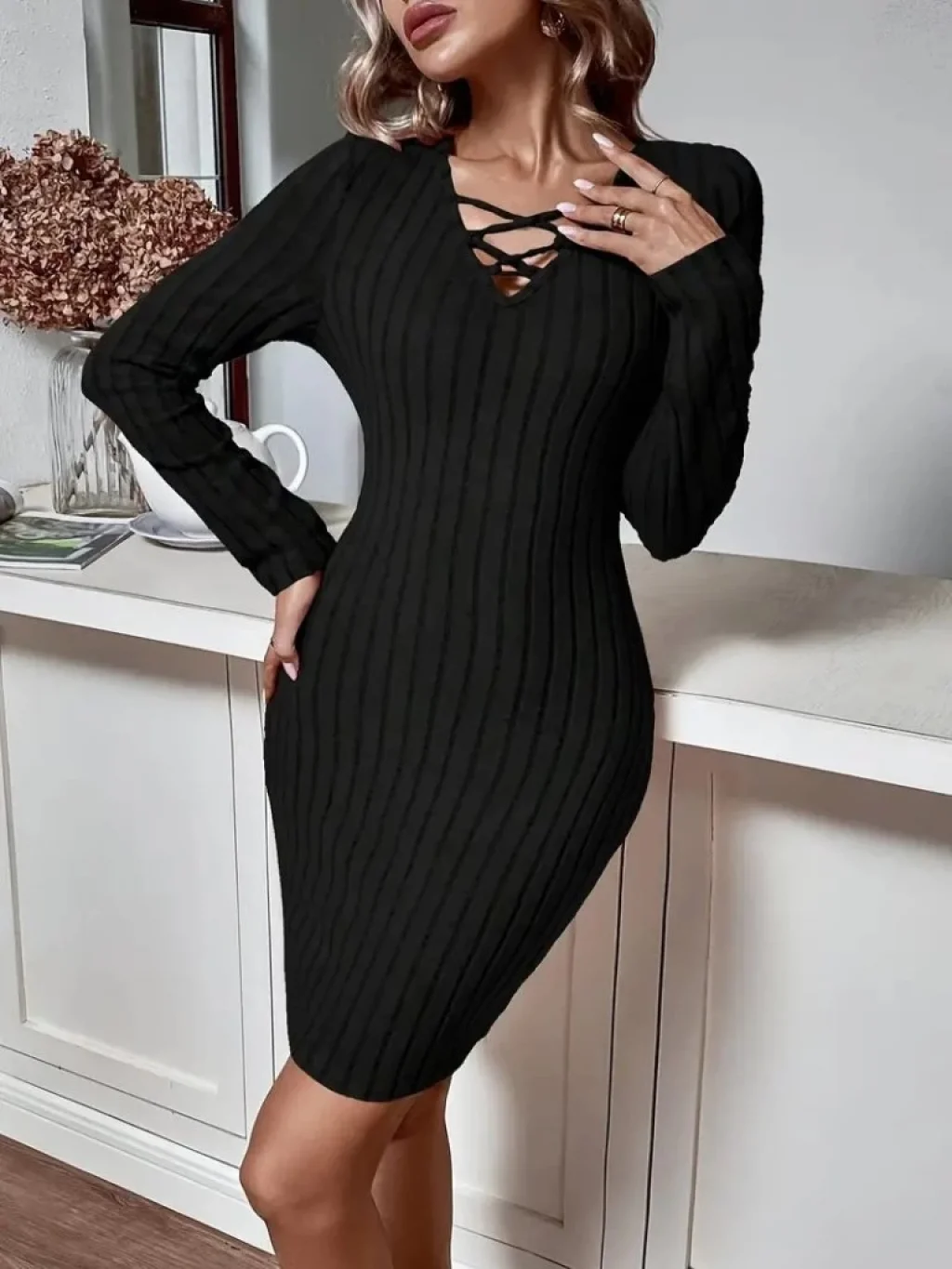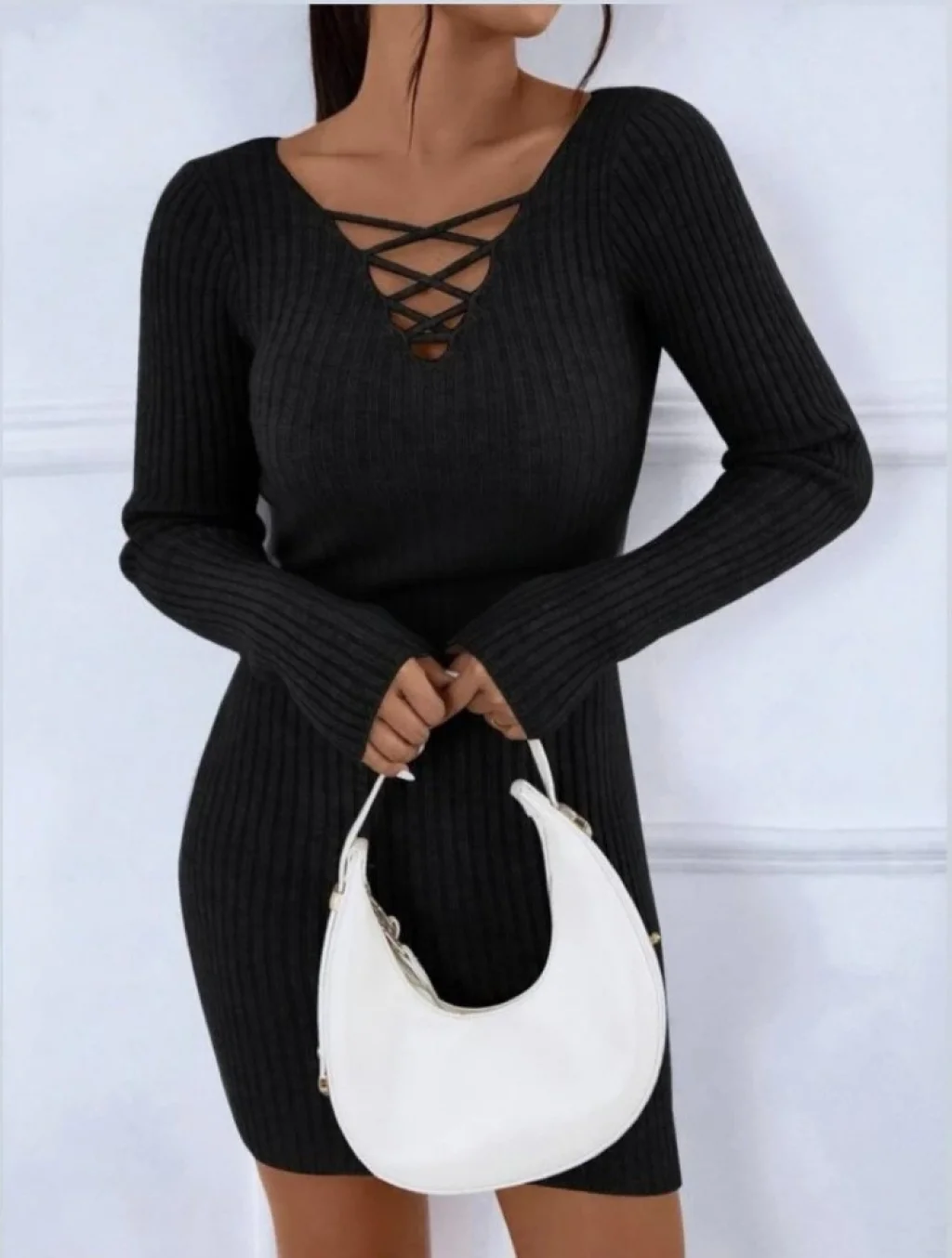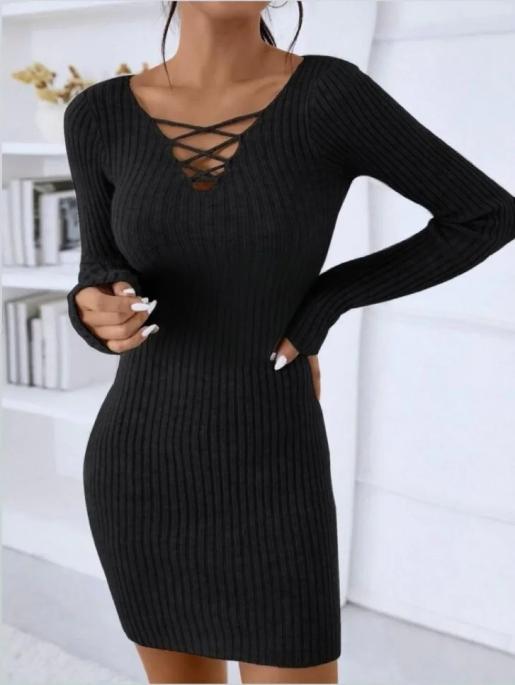 Kadın Uzun Kollu V Yakalı Mini Triko Elbise