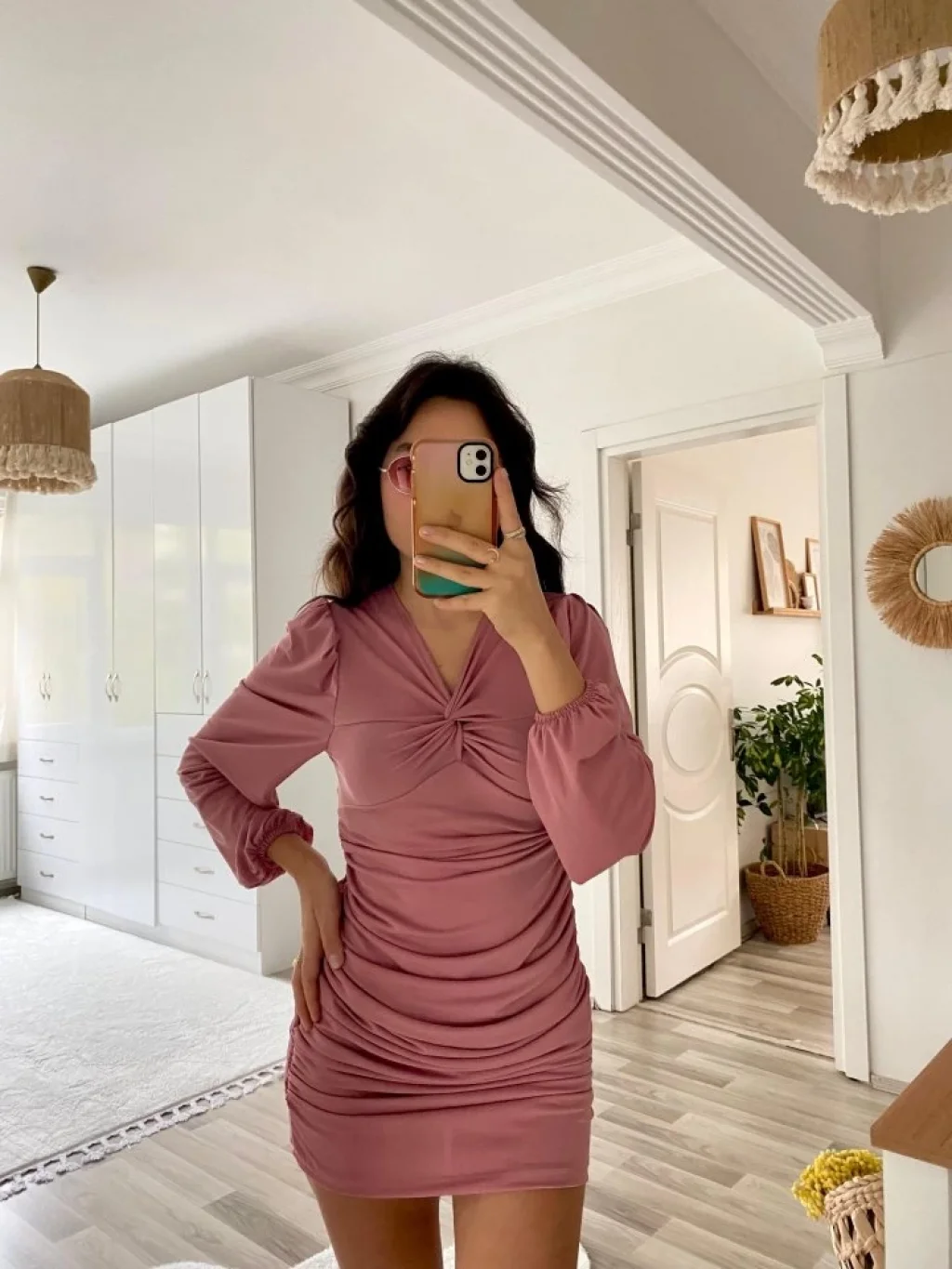 Kadın Uzun Kollu V Yakalı Yanlardan Büzgülü Kısa Sandy Elbise