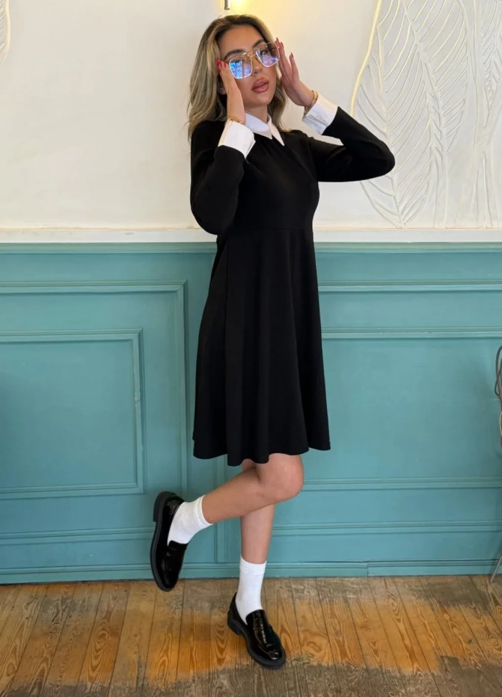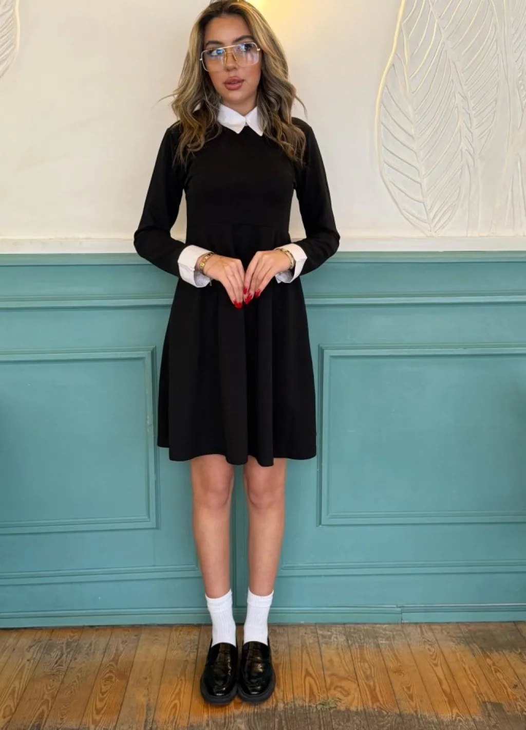Kadın Uzun Kollu Yuvarlak Yaka Pileli Salaş Mini Ithal Krep Elbise
