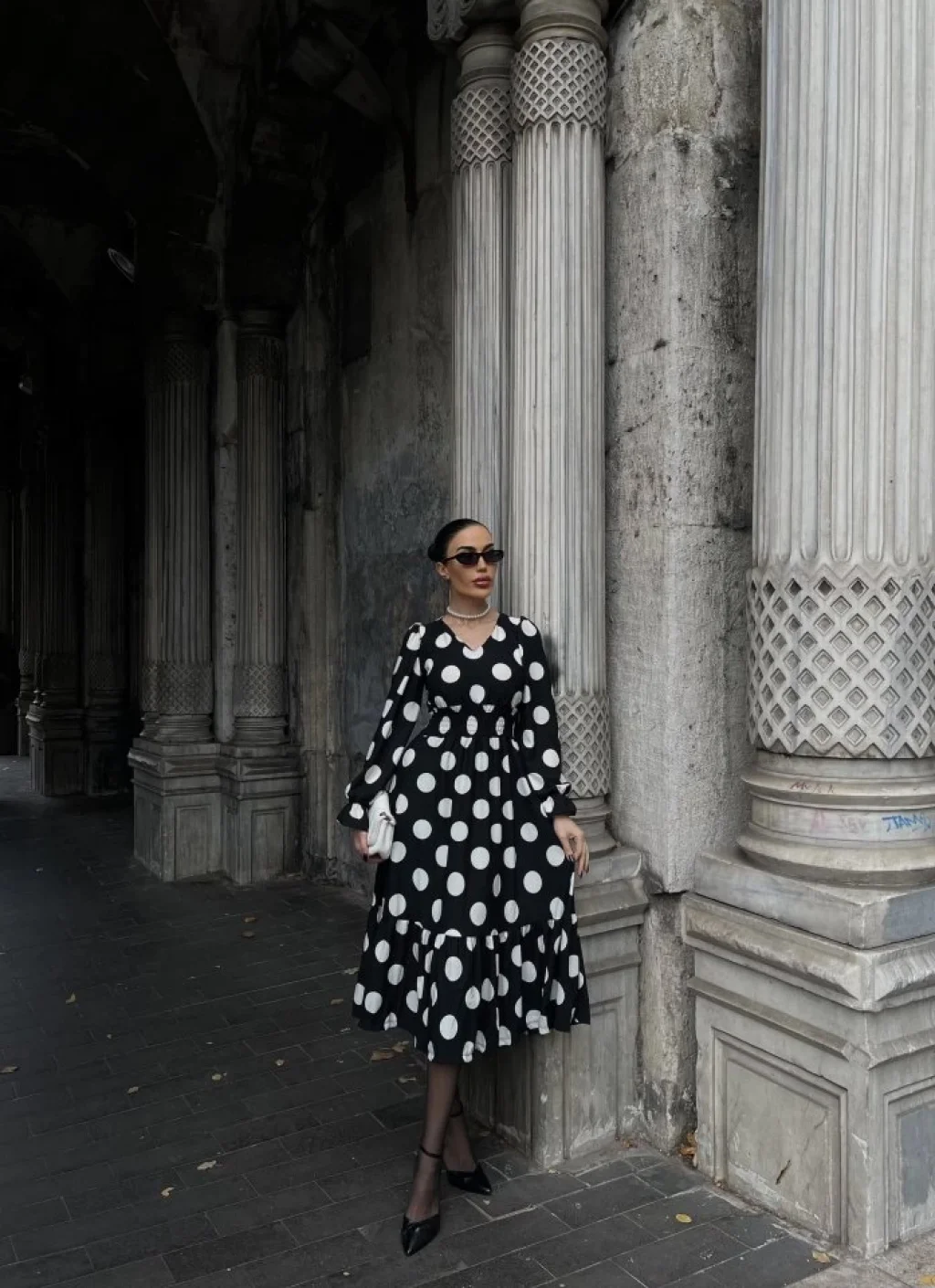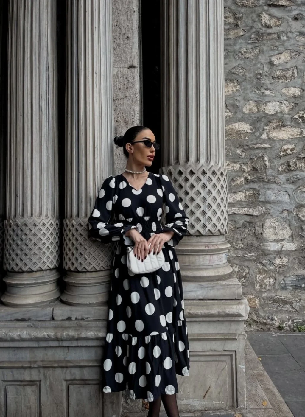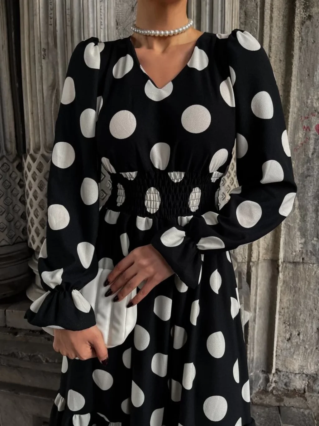 Kadın Uzun Kollu V Yakalı Beli Lastikli Puantiyeli Uzun Krep Elbise