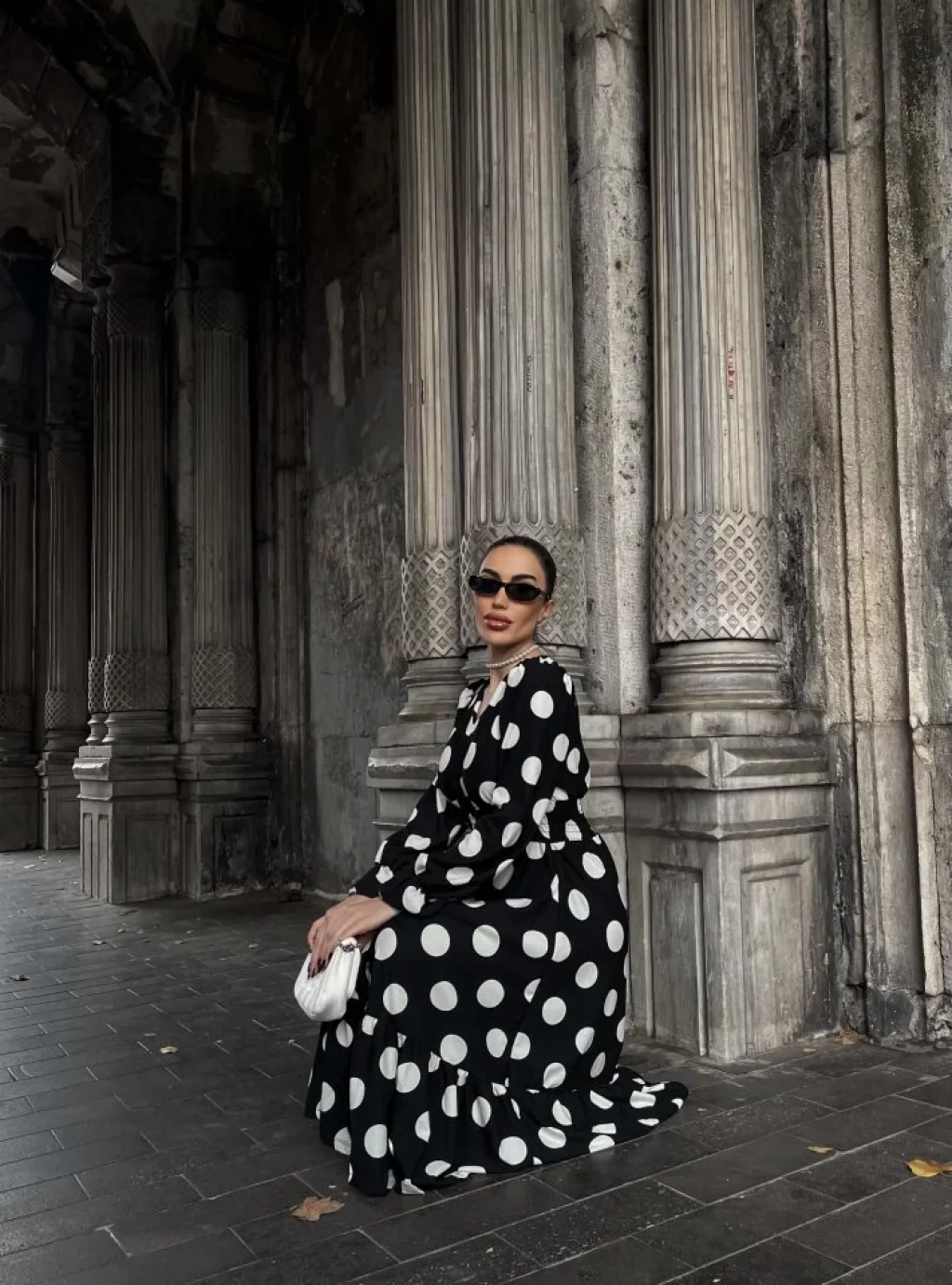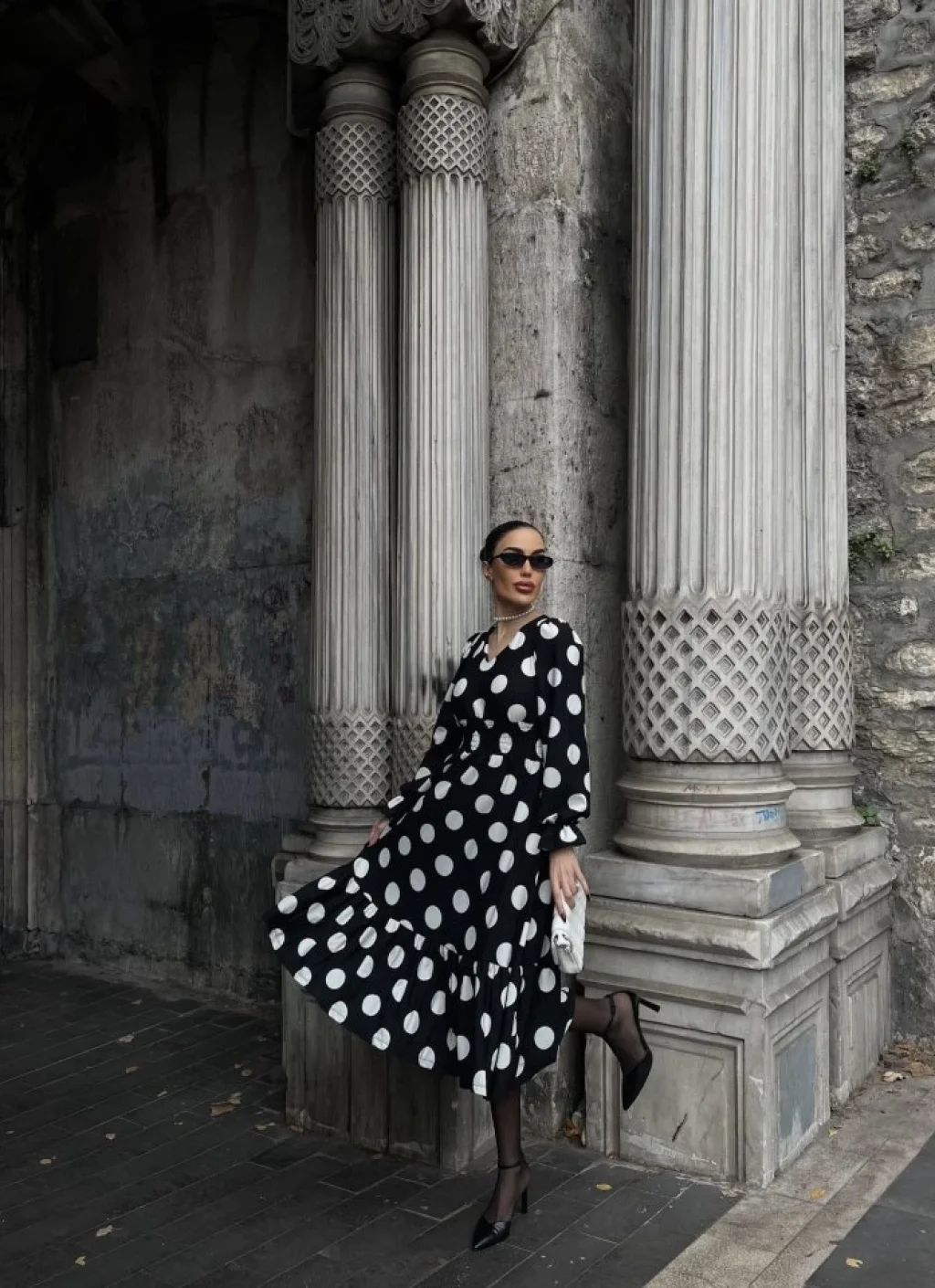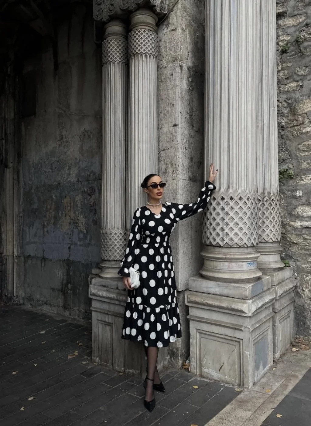 Kadın Uzun Kollu V Yakalı Beli Lastikli Puantiyeli Uzun Krep Elbise