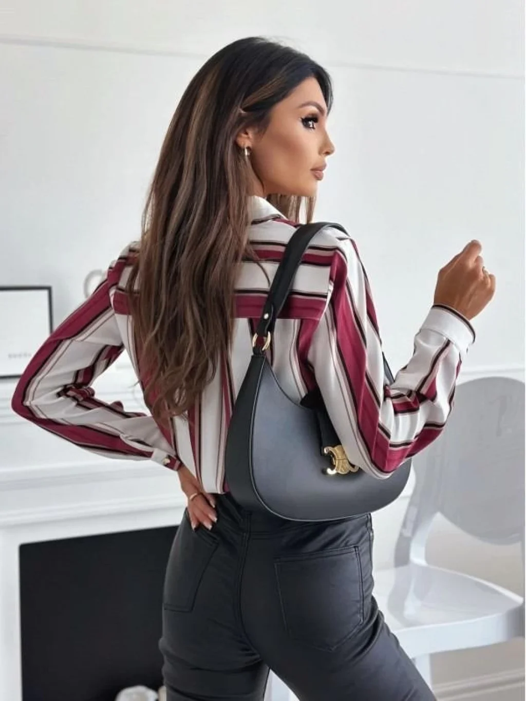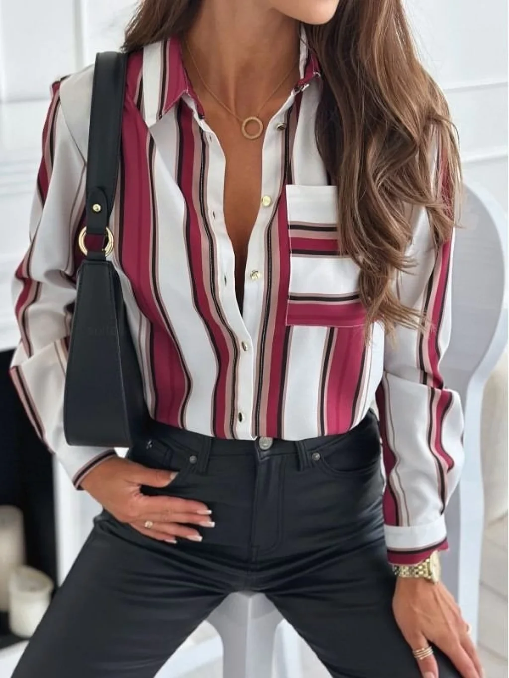 Kadın Uzun Kollu Fırfır Yakalı önden Düğmeli çizgili Burgu Gömlek