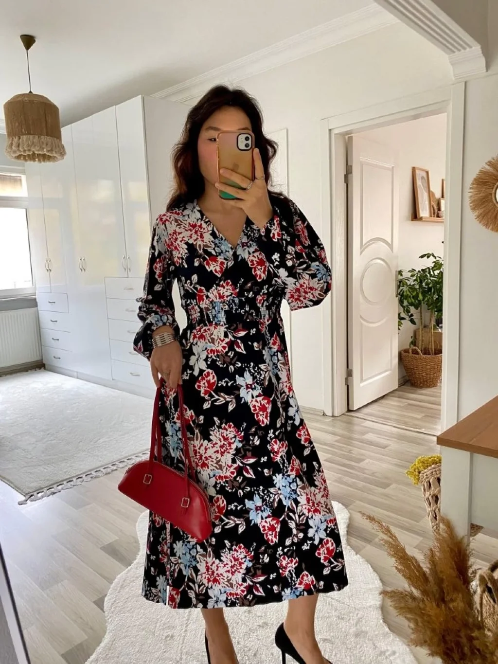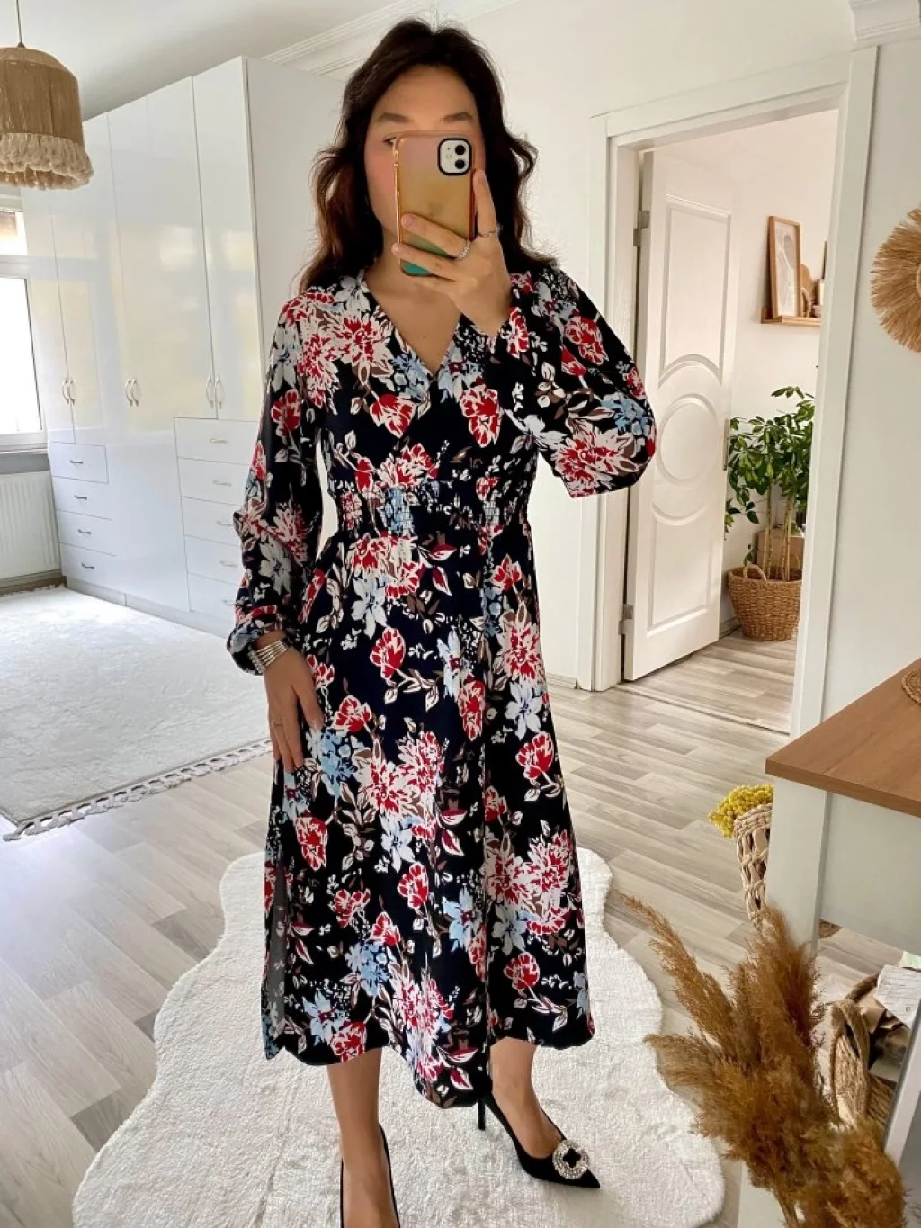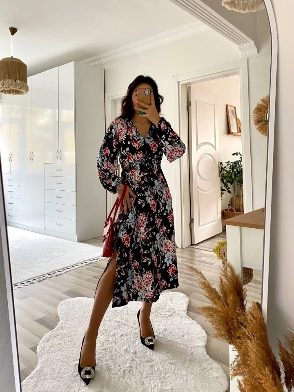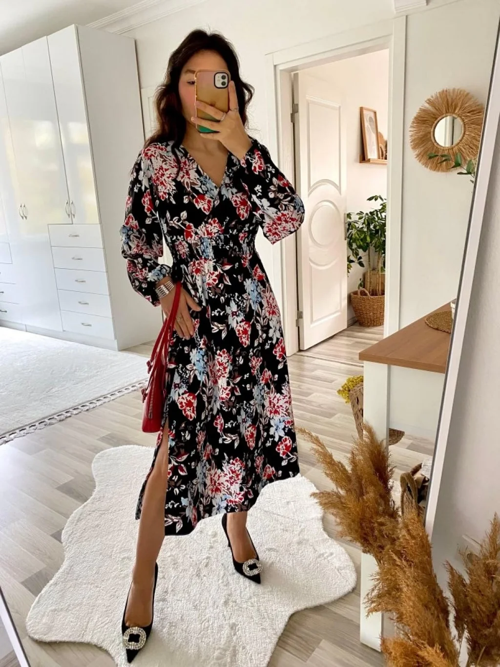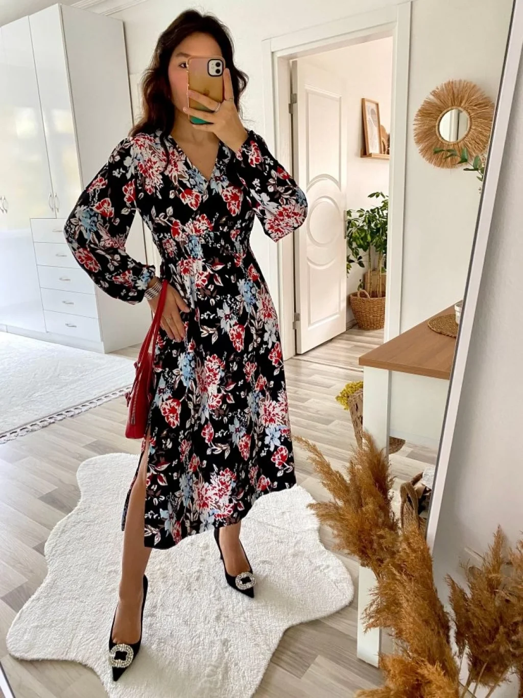 Kadın Uzun Kollu Kruvaze Yaka Beli Lastikli Yandan Yırtmaçlı Desenli Dalgıç Elbise