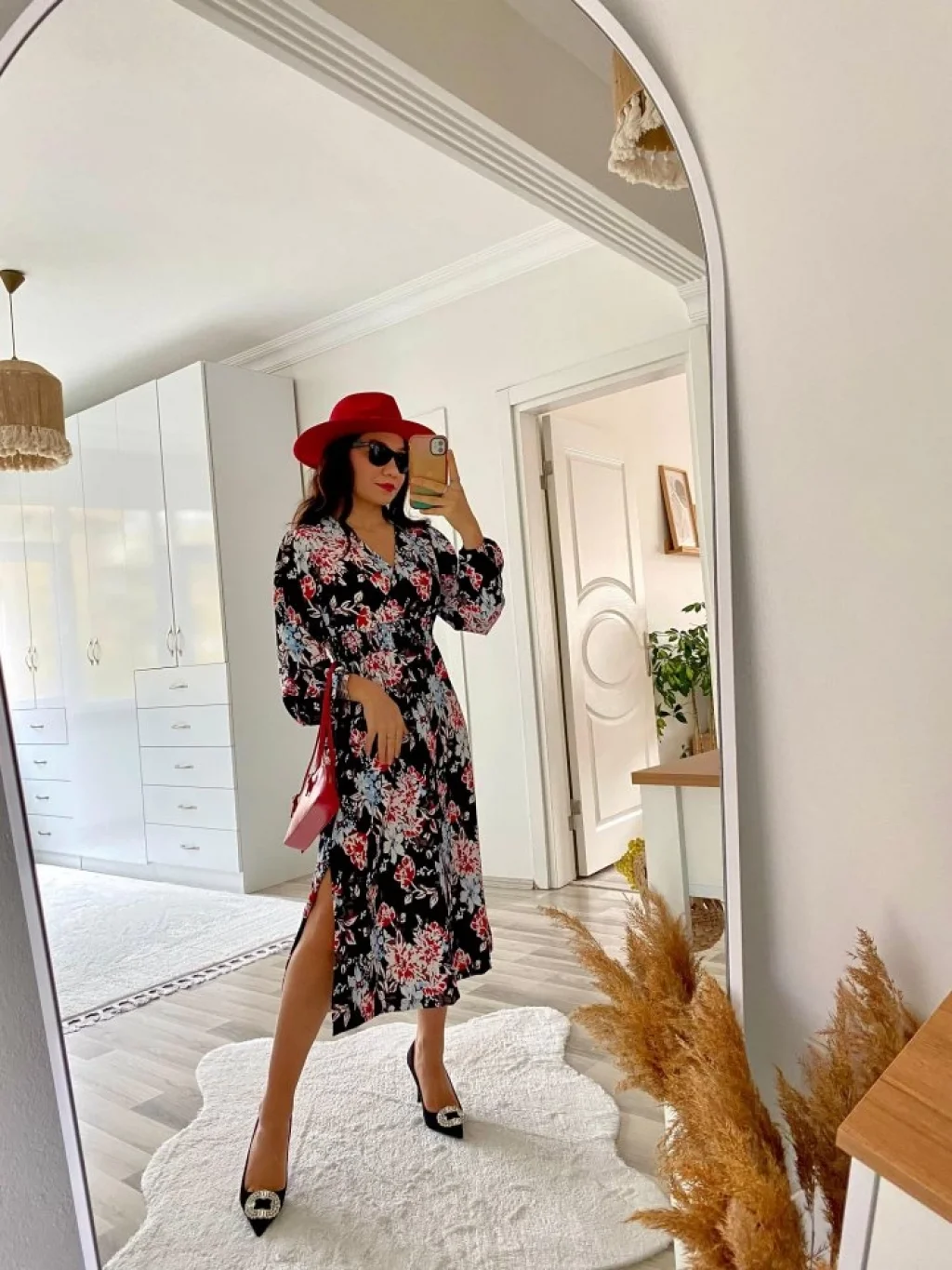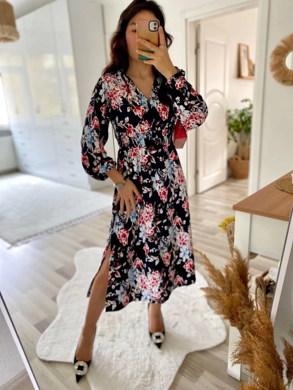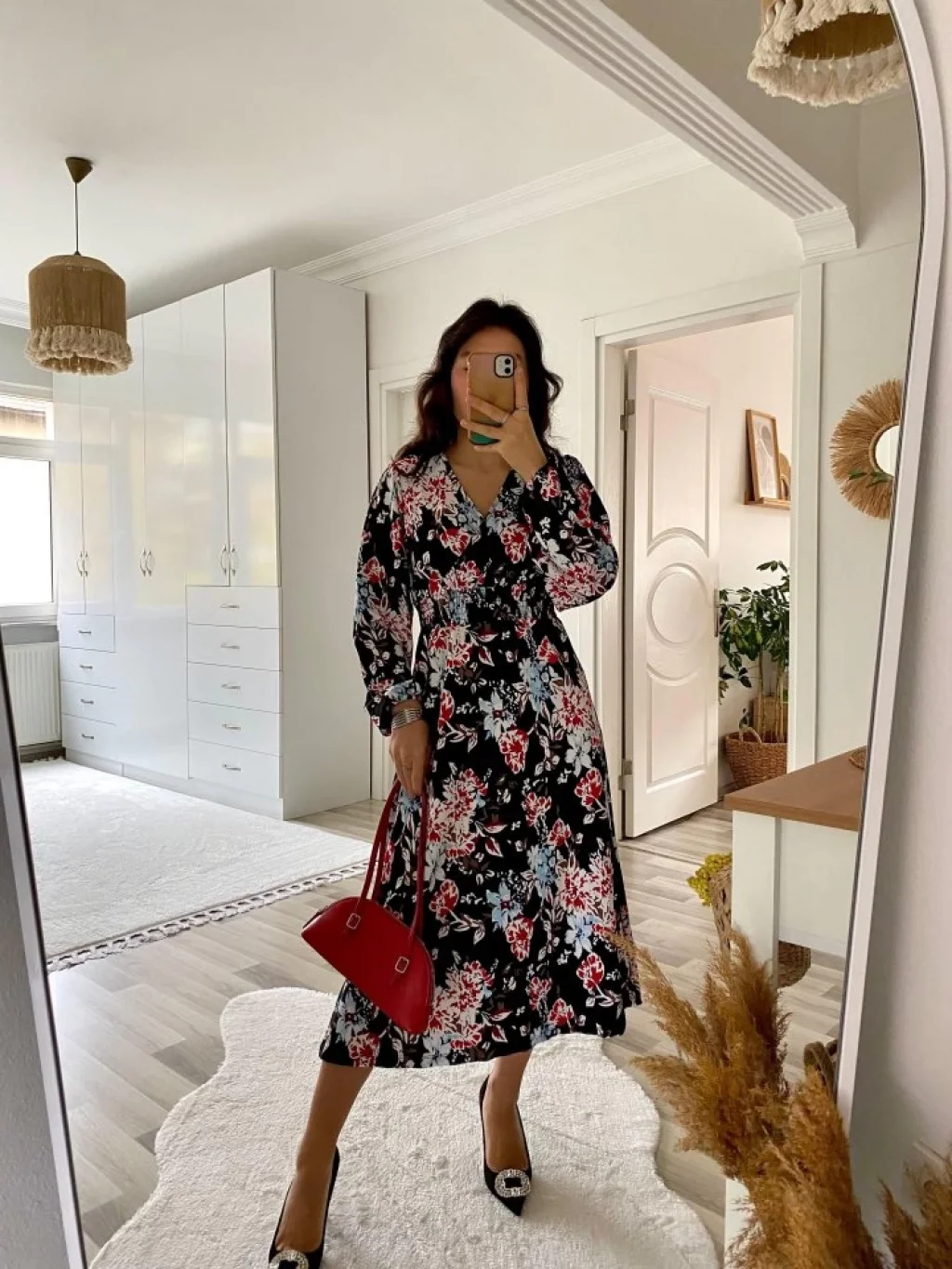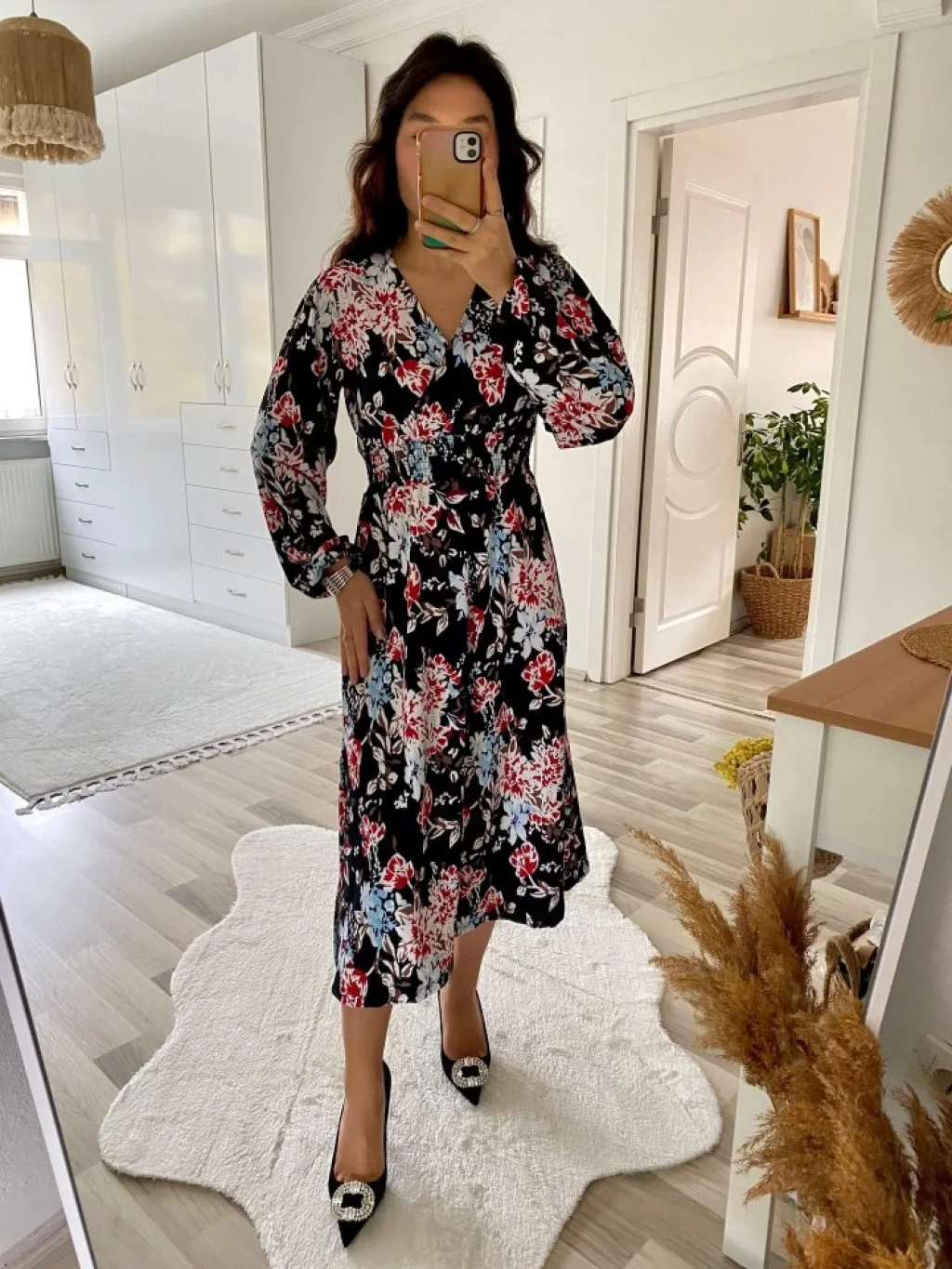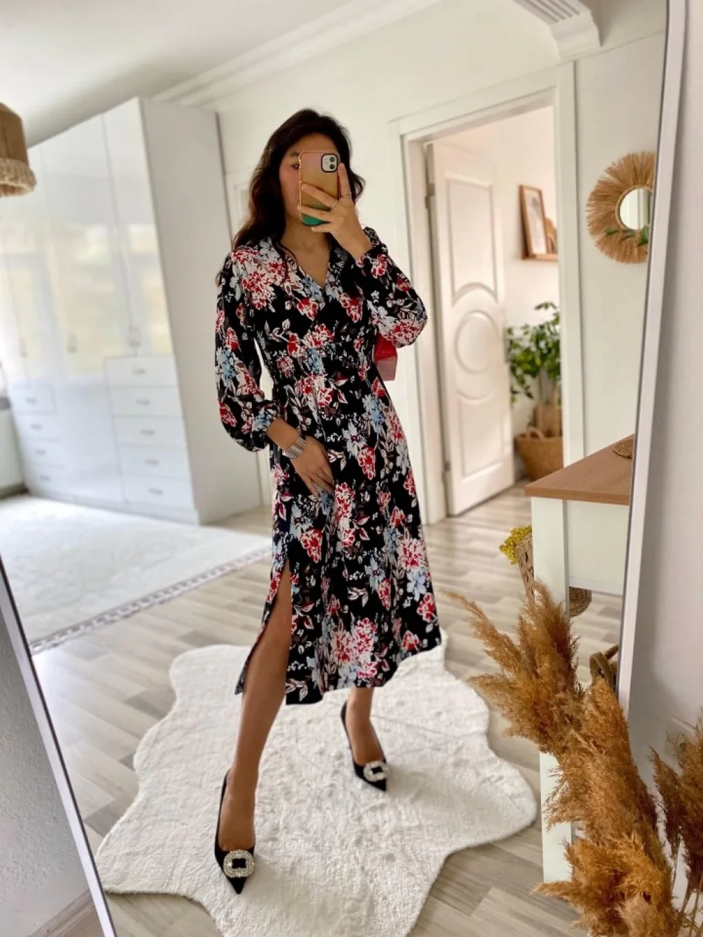 Kadın Uzun Kollu Kruvaze Yaka Beli Lastikli Yandan Yırtmaçlı Desenli Dalgıç Elbise