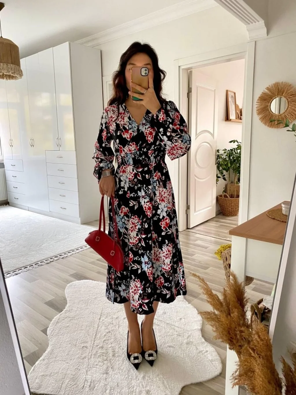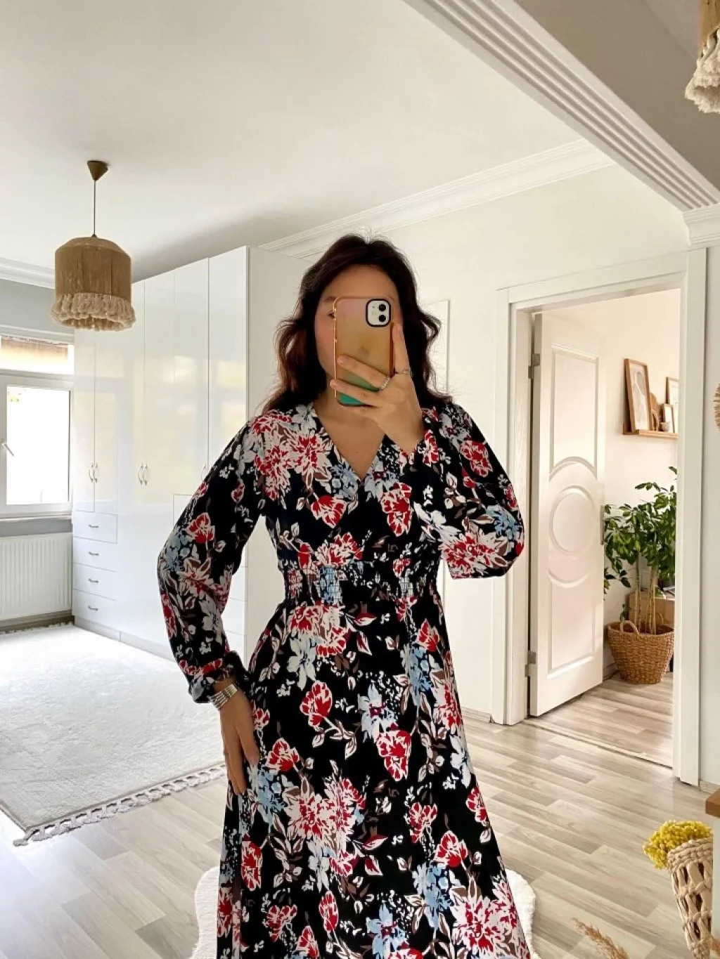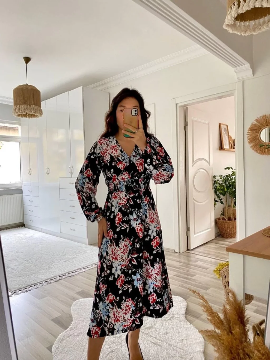 Kadın Uzun Kollu Kruvaze Yakalı Desenli Süprem Maxi Elbise