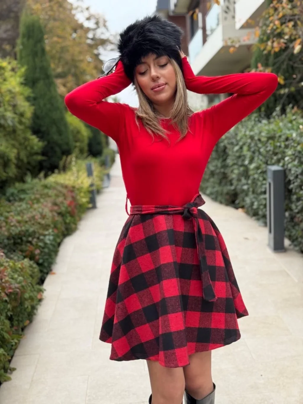 Kadın Uzun Kollu Bisiklet Yaka üst Viskon Alt Ekose Kısa Elbise