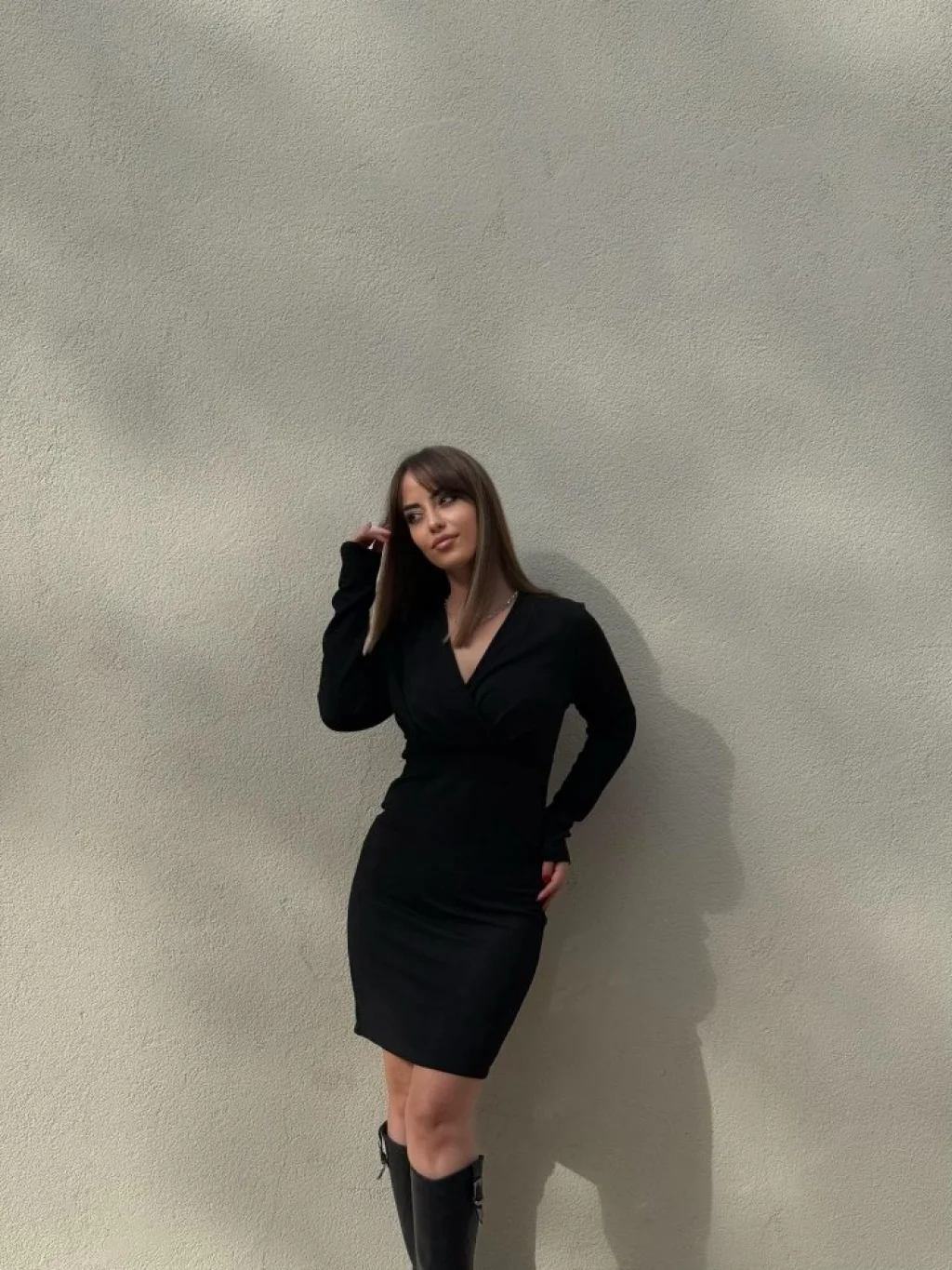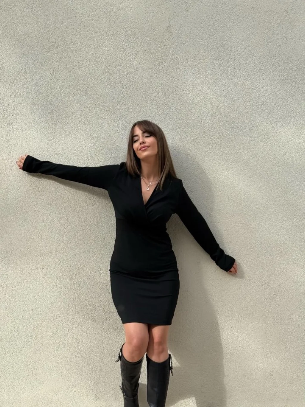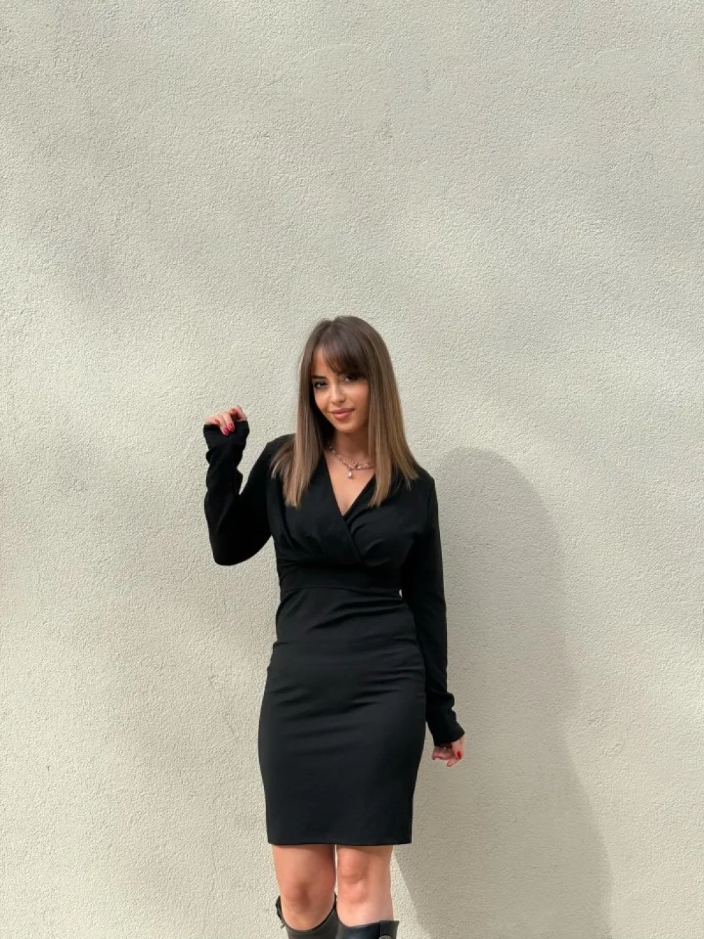 Kadın Uzun Kollu Kruvaze Yaka Krep Mini Boy Elbise
