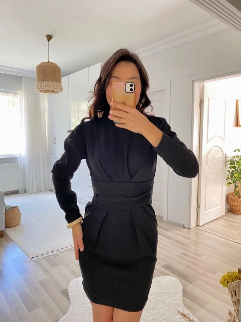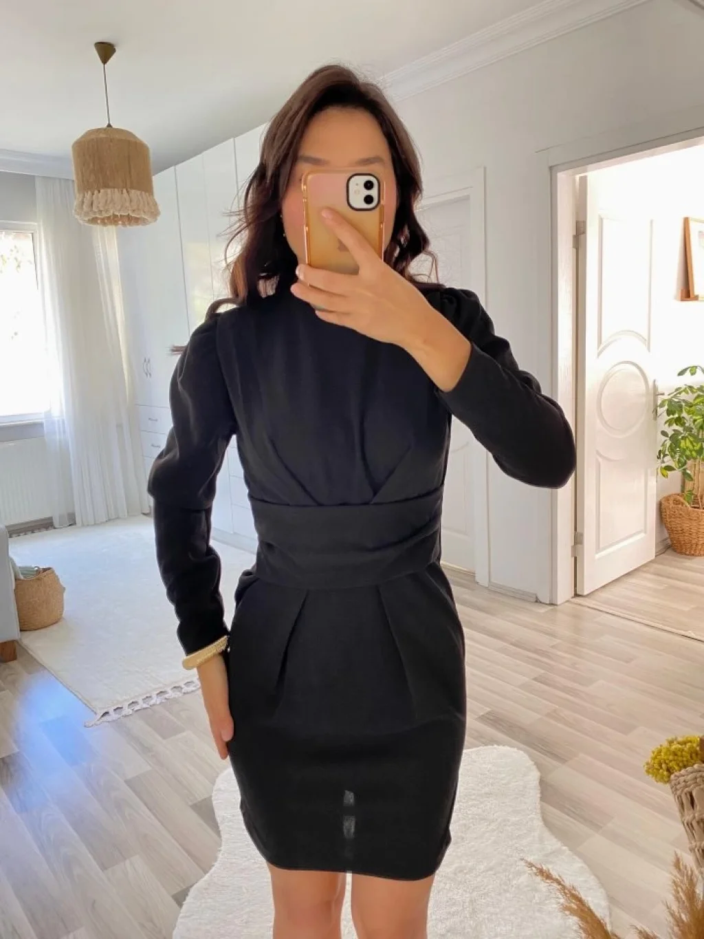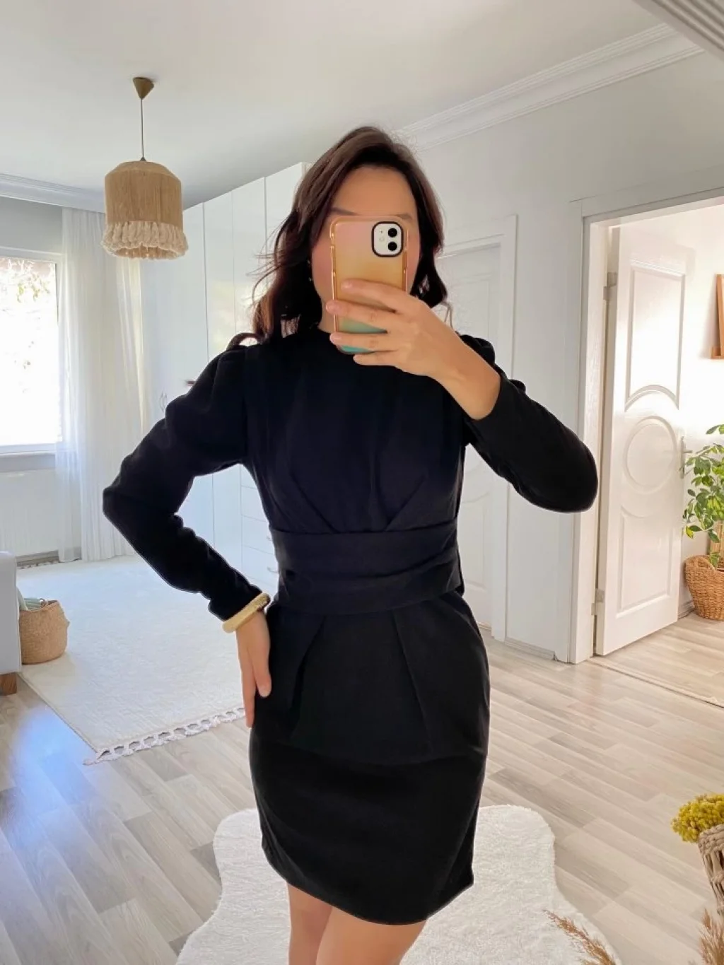 Kadın Uzun Kollu Yuvarlak Yaka Pileli Salaş Mini Ithal Krep Elbise