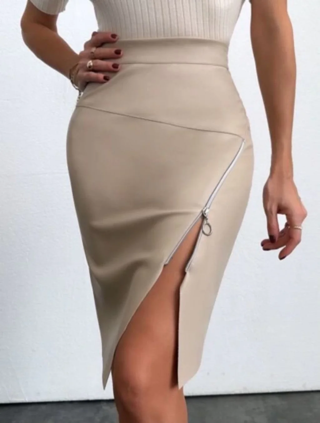 Kadın Yüksek Bel Yandan Fermuarlı Ve Yırtmaçlı Deri Etek