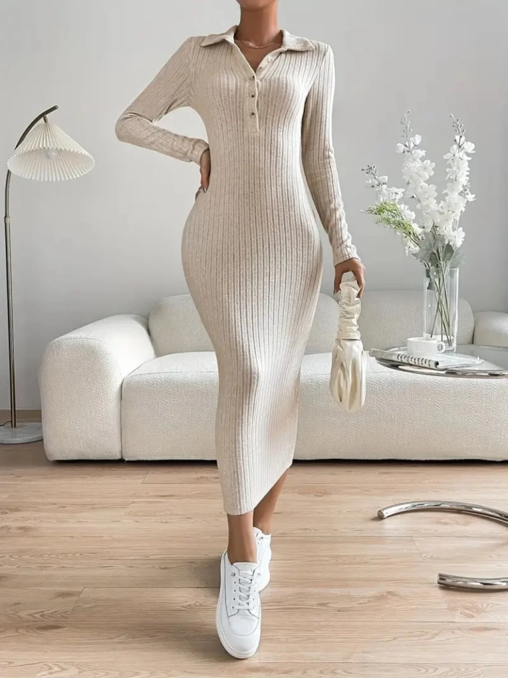 Kadın Uzun Kollu Balıkçı Yaka Yırtmaçlı Düğmeli şardonlu Kaşkorse Elbise