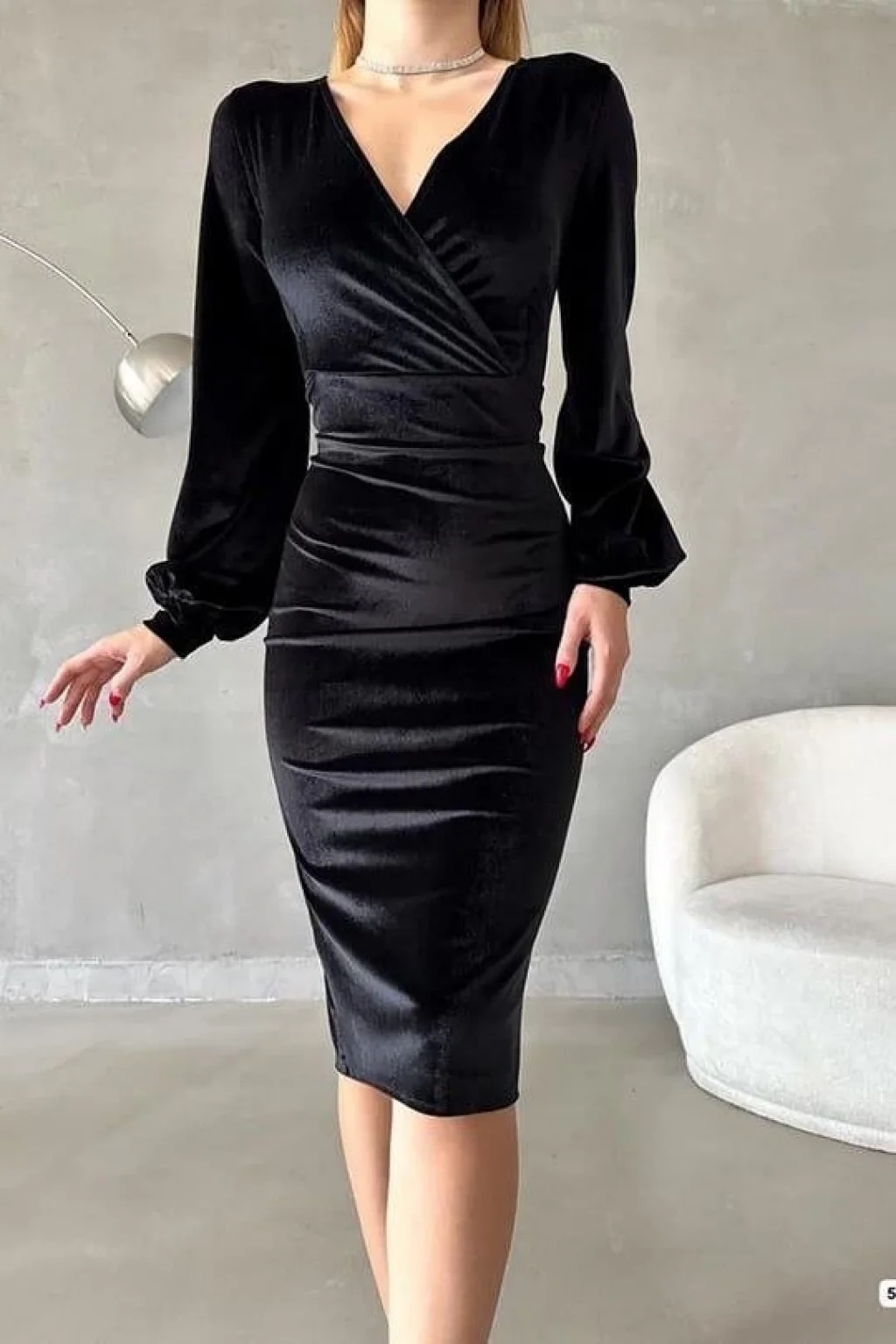 Kadın Uzun Kollu Göğüs Dekolteli Kadife Kumaş Mini Kruvaze Elbise