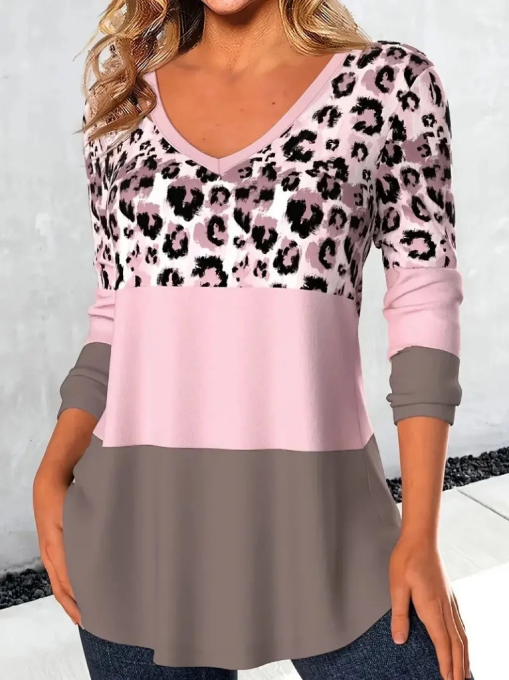 Kadın Uzun Kollu V Yakalı Leopar Baskılı şardonlu Dalgıç Bluz