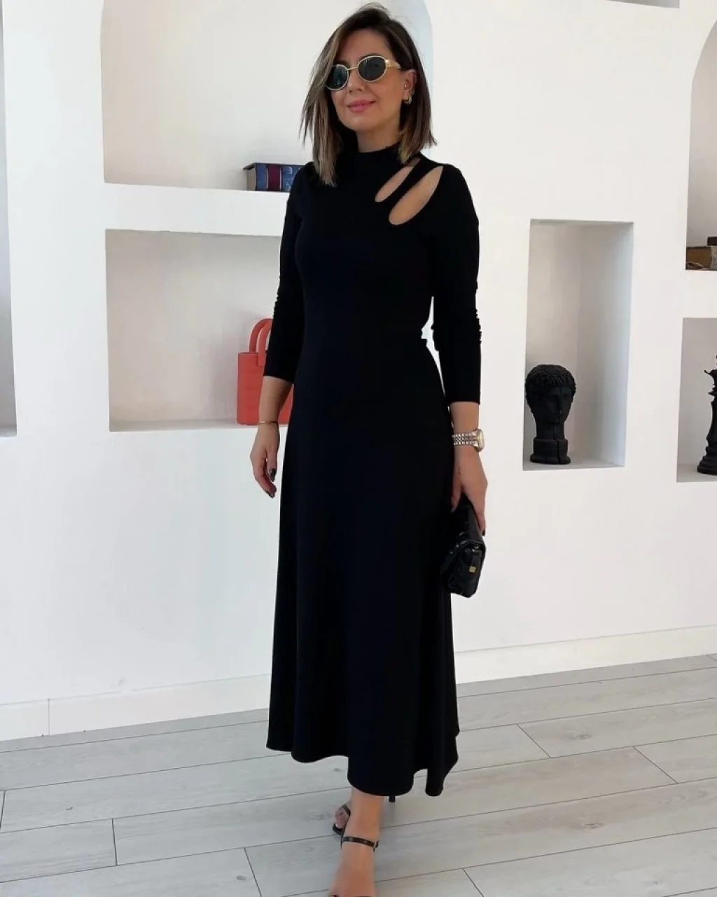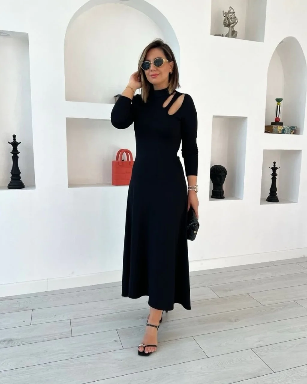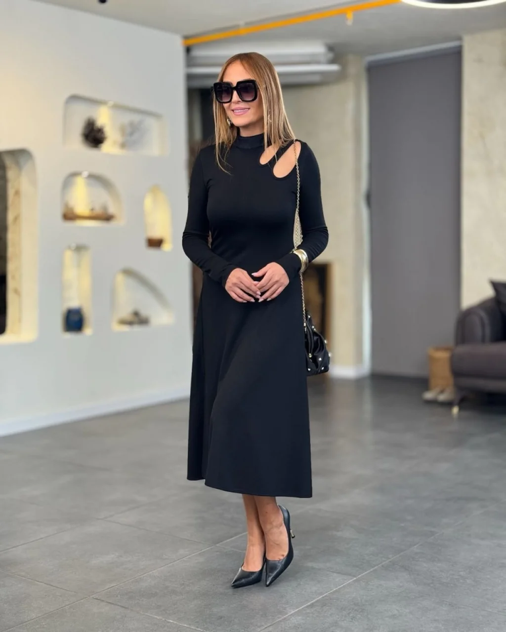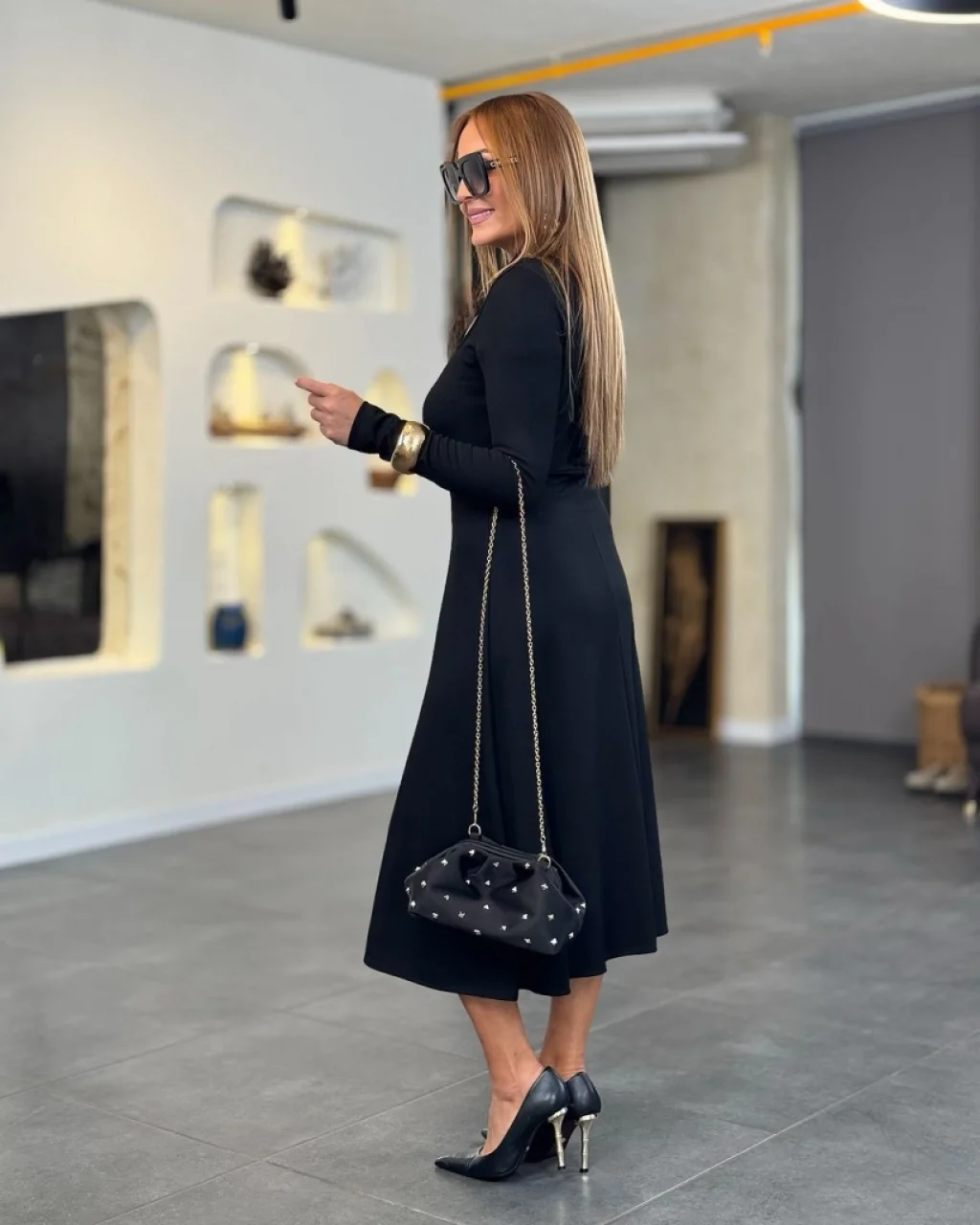 Kadın Uzun Kollu Geometrik Yaka Midi Ithal Krep Elbise