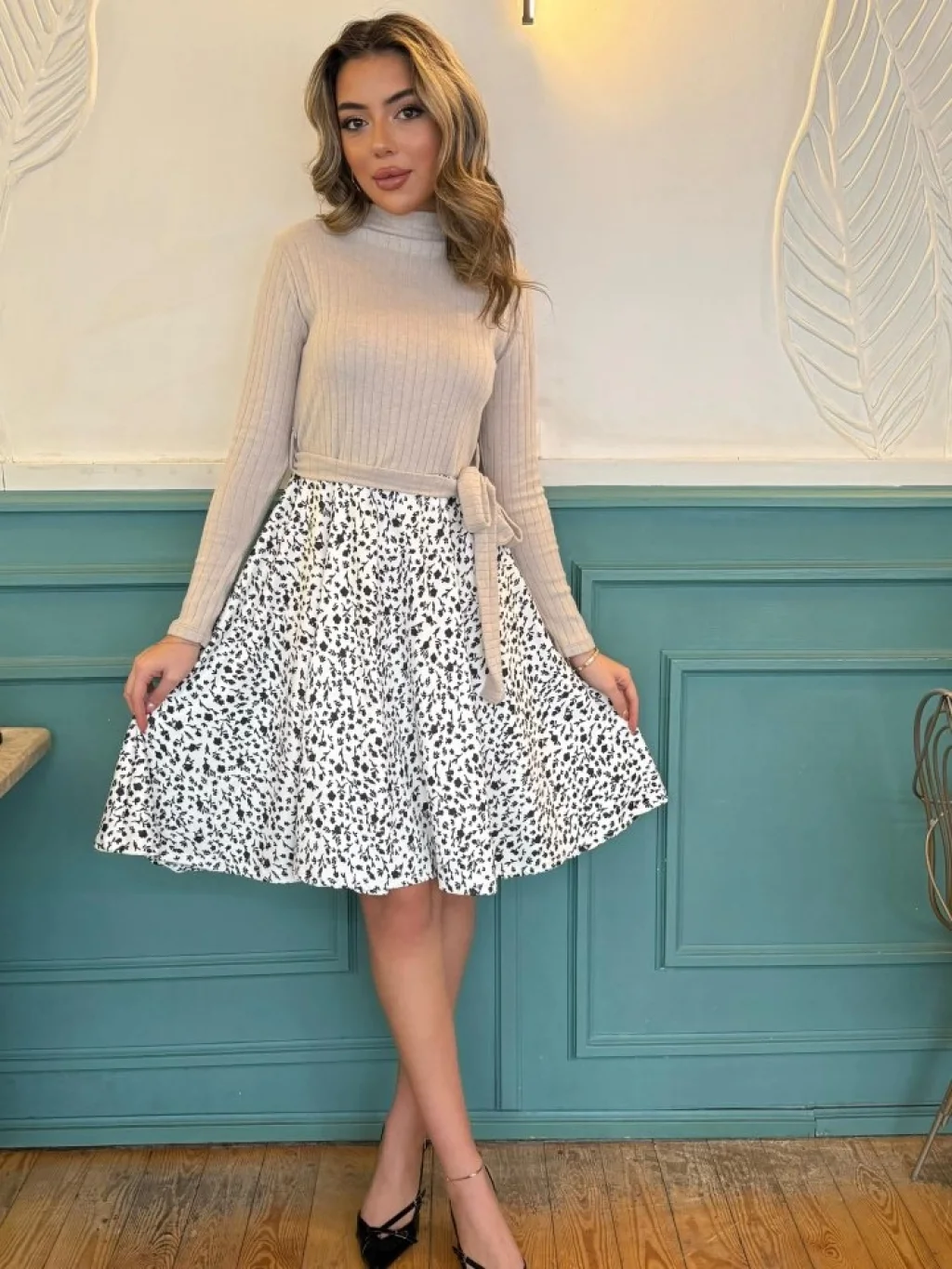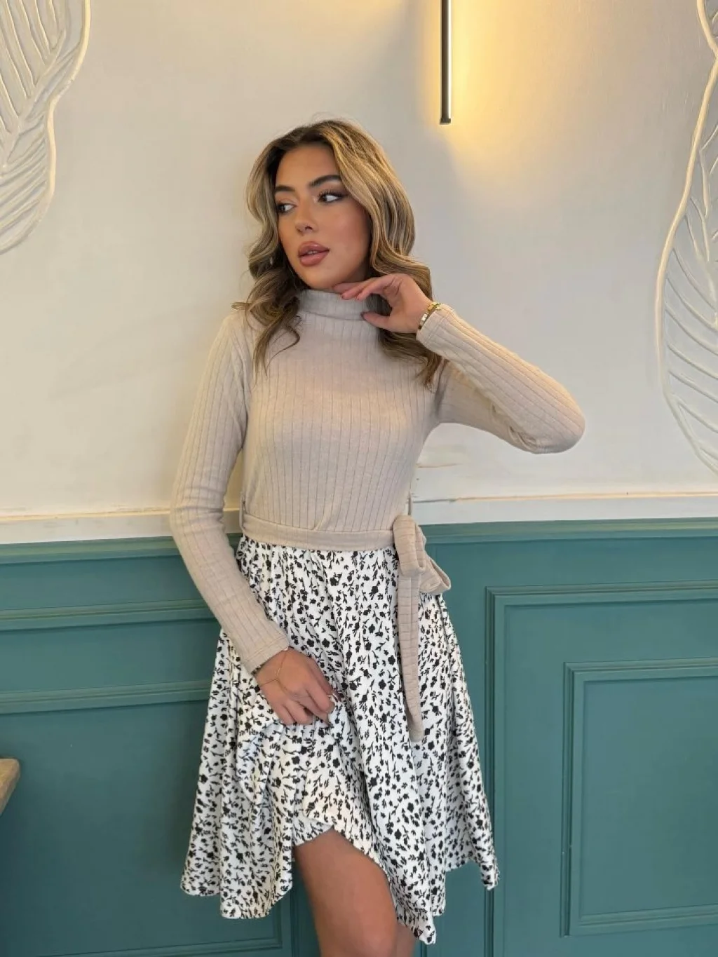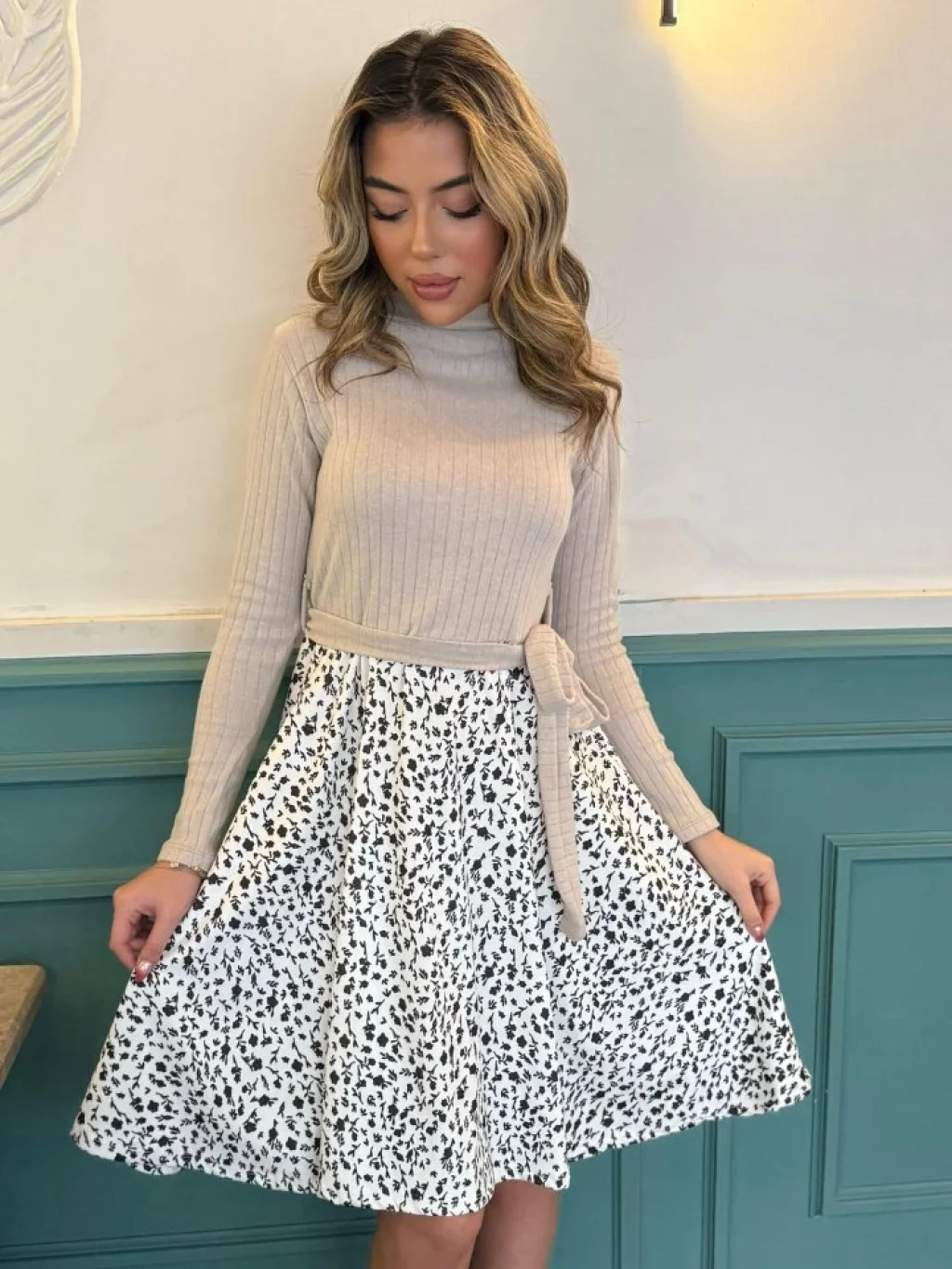 Kadın Uzun Kollu Balıkçı Yaka Belden Bağlamalı üst Kaşkorse Eteği Dalgıç Kısa Elbise