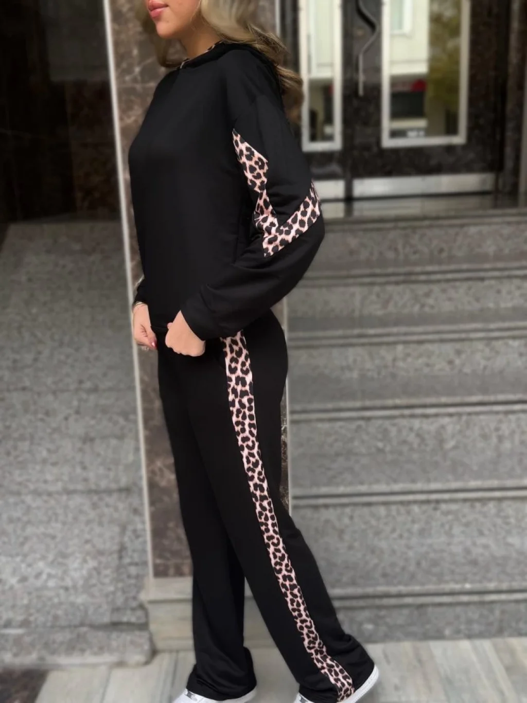 Kadın Kapüşonlu Leopar Detay Sweat Ve Yüksek Bel Yanları Leopar şeritli Bol Paça Pantolon Ikili Takım