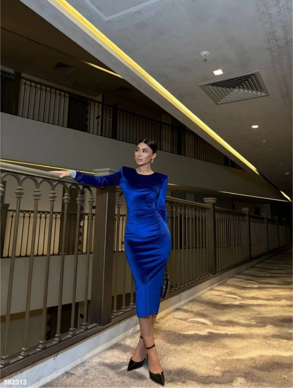 Kadın Bisiklet Yaka Vatkalı Manşet Detay Kadife Kumaş Midi Boy Elbise