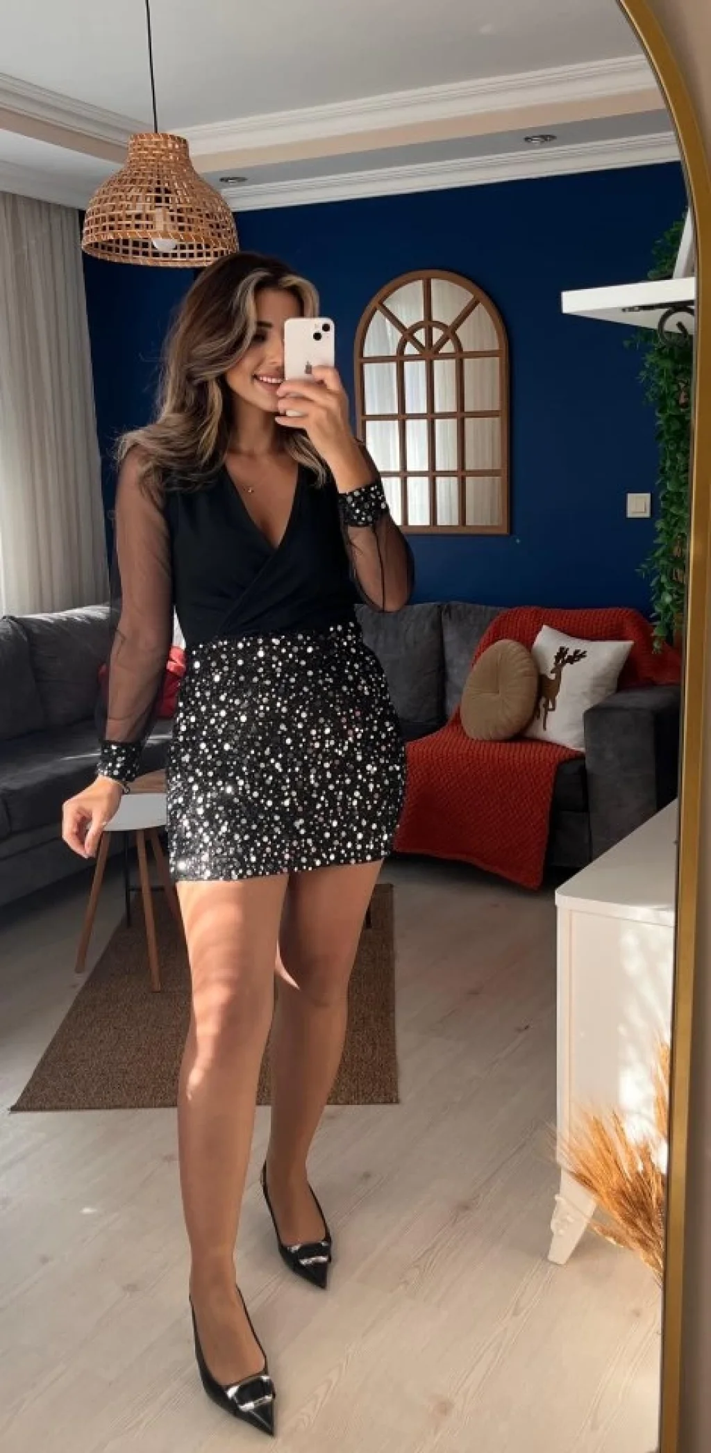 Kadın Uzun Kollu V Yakalı üst Krep Alt Payet Kısa Elbise