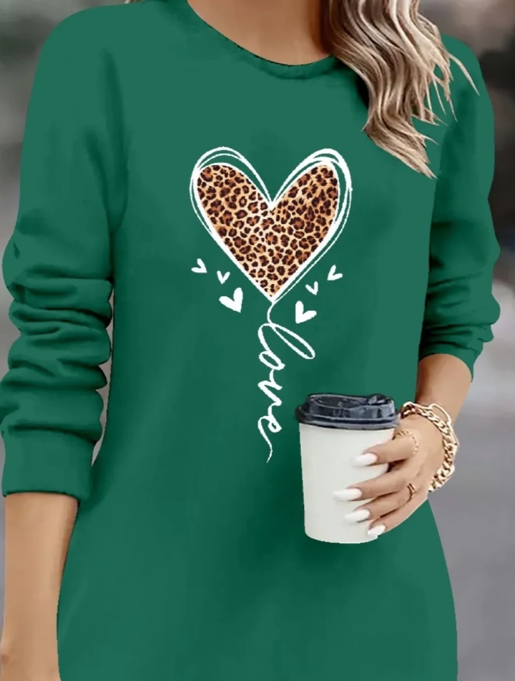Kadın Uzun Kollu Bisiklet Yaka Kalp Desenli Kısa Viskon Elbise