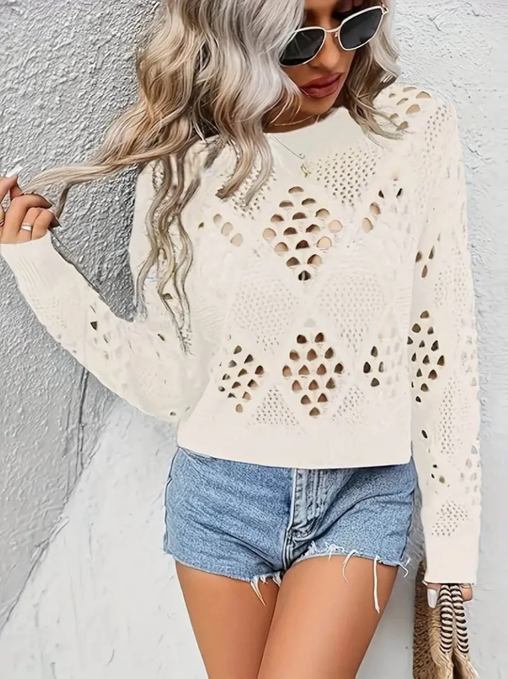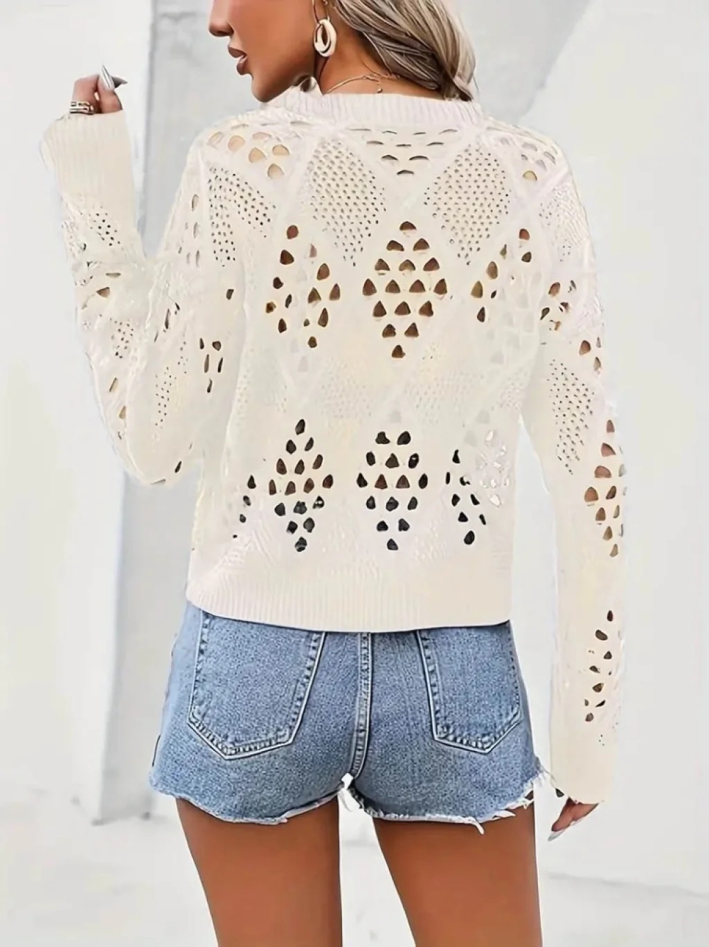 Kadın Uzun Kollu Yuvarlak Yaka Delik Desenli Triko Bluz