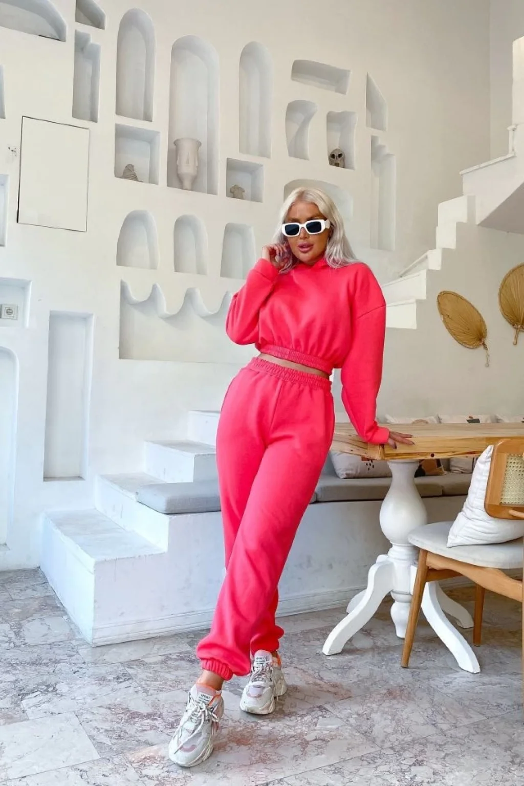 Kadın Uzun Kollu Kapüşonlu Beli Lastik Detay Sweat Ve Yüksek Bel Bileği Lastikli Pantolon üç üplik Kumaş Ikili Takım