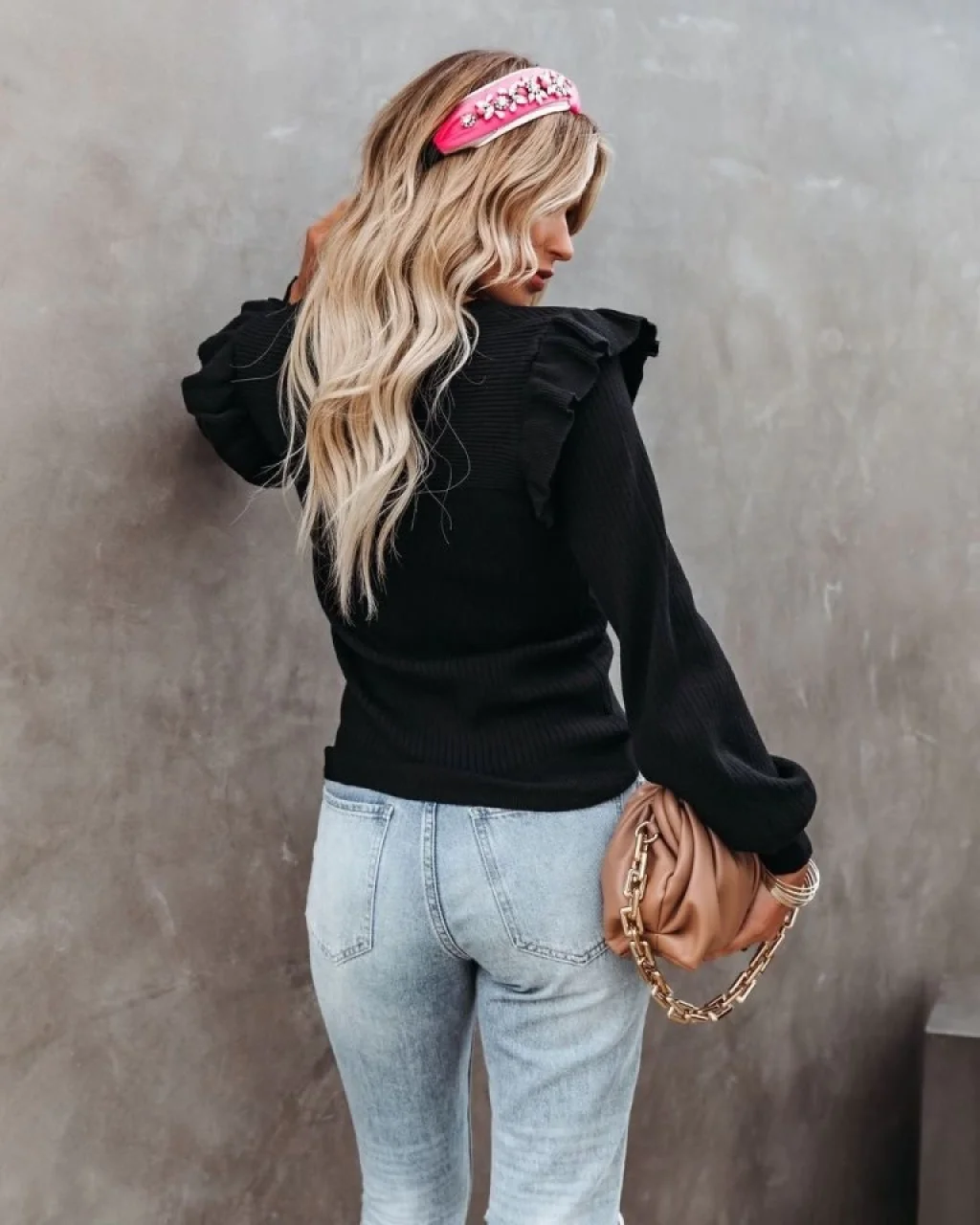 Kadın Uzun Kollu Bisiklet Yaka Omuzları Fırfırlı Triko Bluz