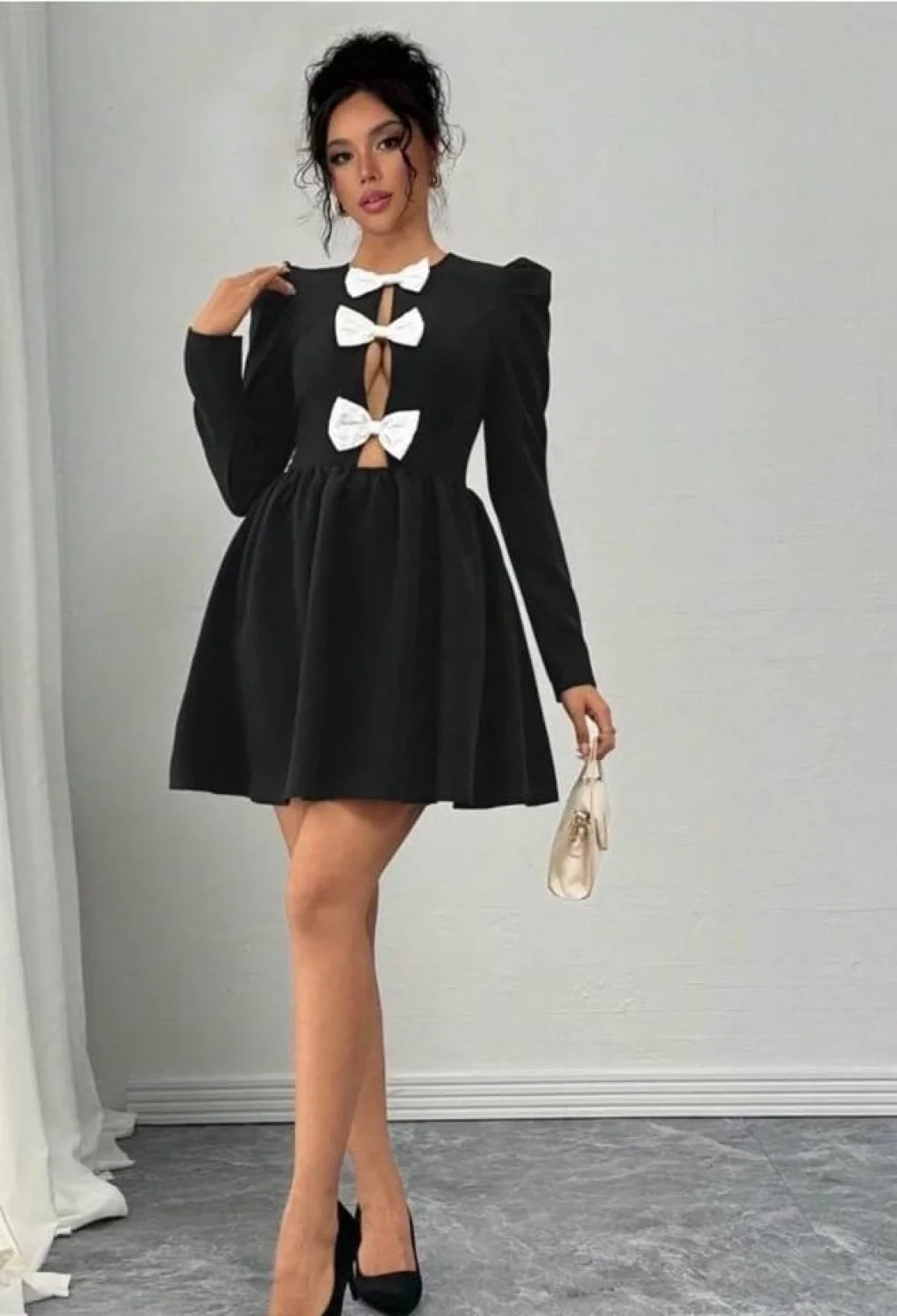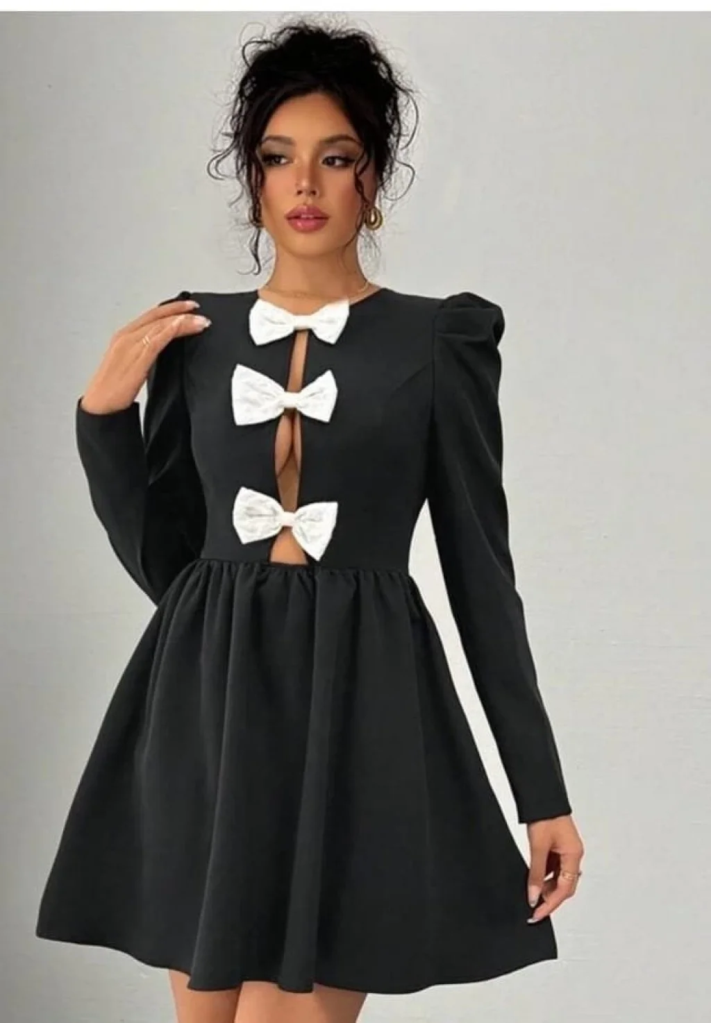 Kadın Dalgıç Kumaş Fiyonk Detaylı Uzun Kollu Mini Boy Elbise