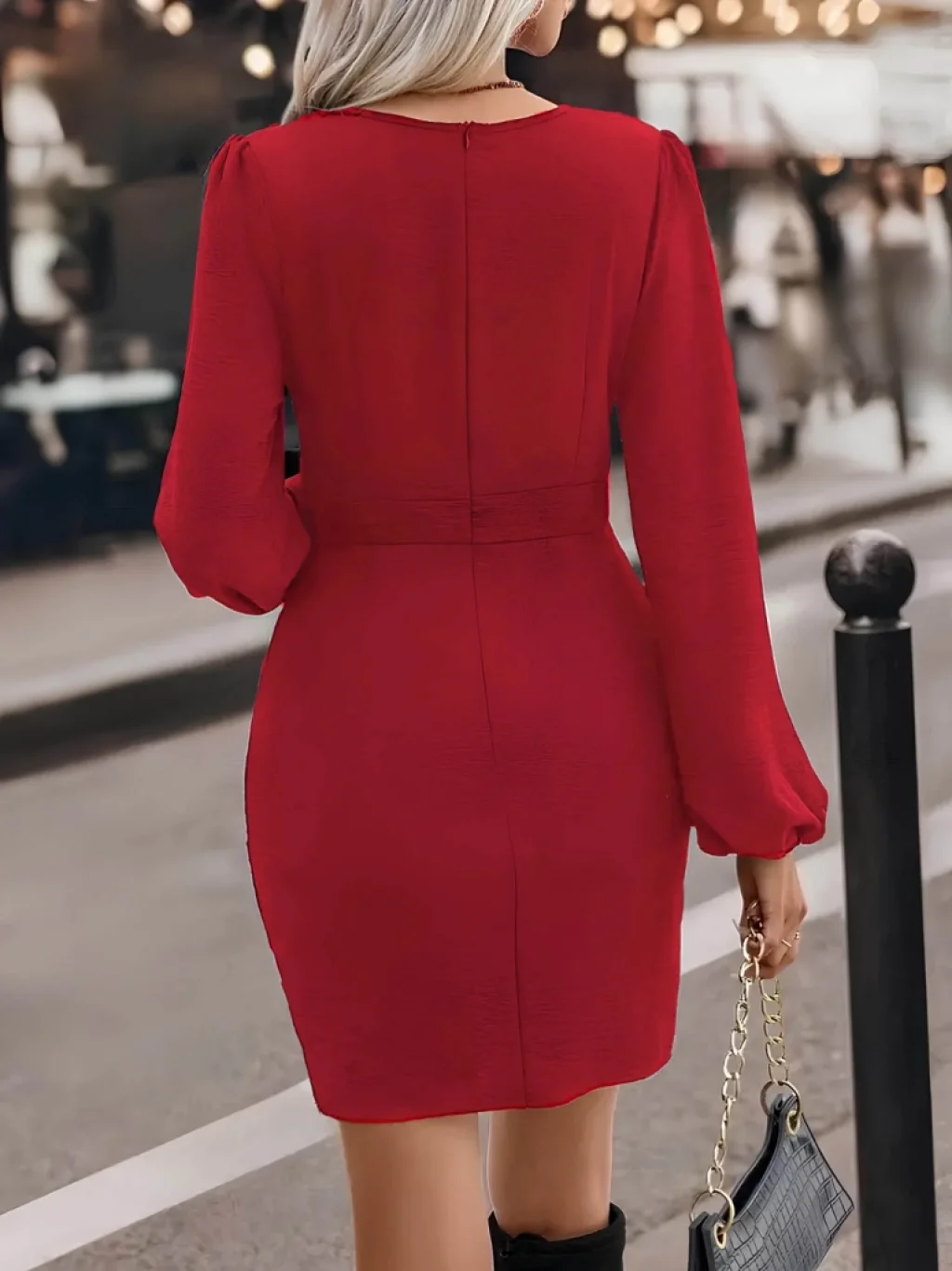 Kadın Uzun Kollu Göğüs Dekolteli Kadife Kumaş Mini Kruvaze Elbise
