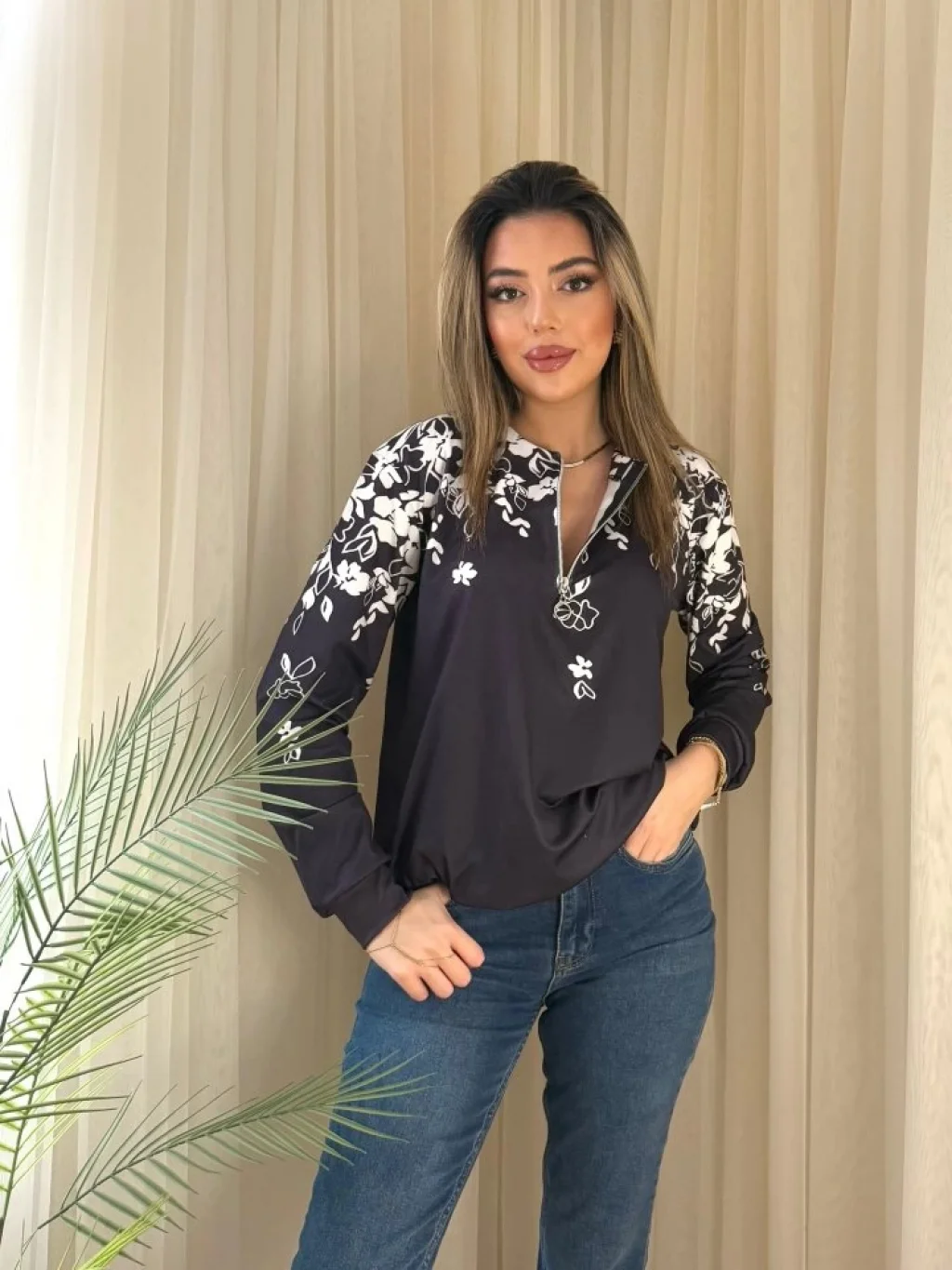 Kadın Uzun Kollu önden Fermuarlı çiçek Desenli şardonlu Dalgıç Bluz