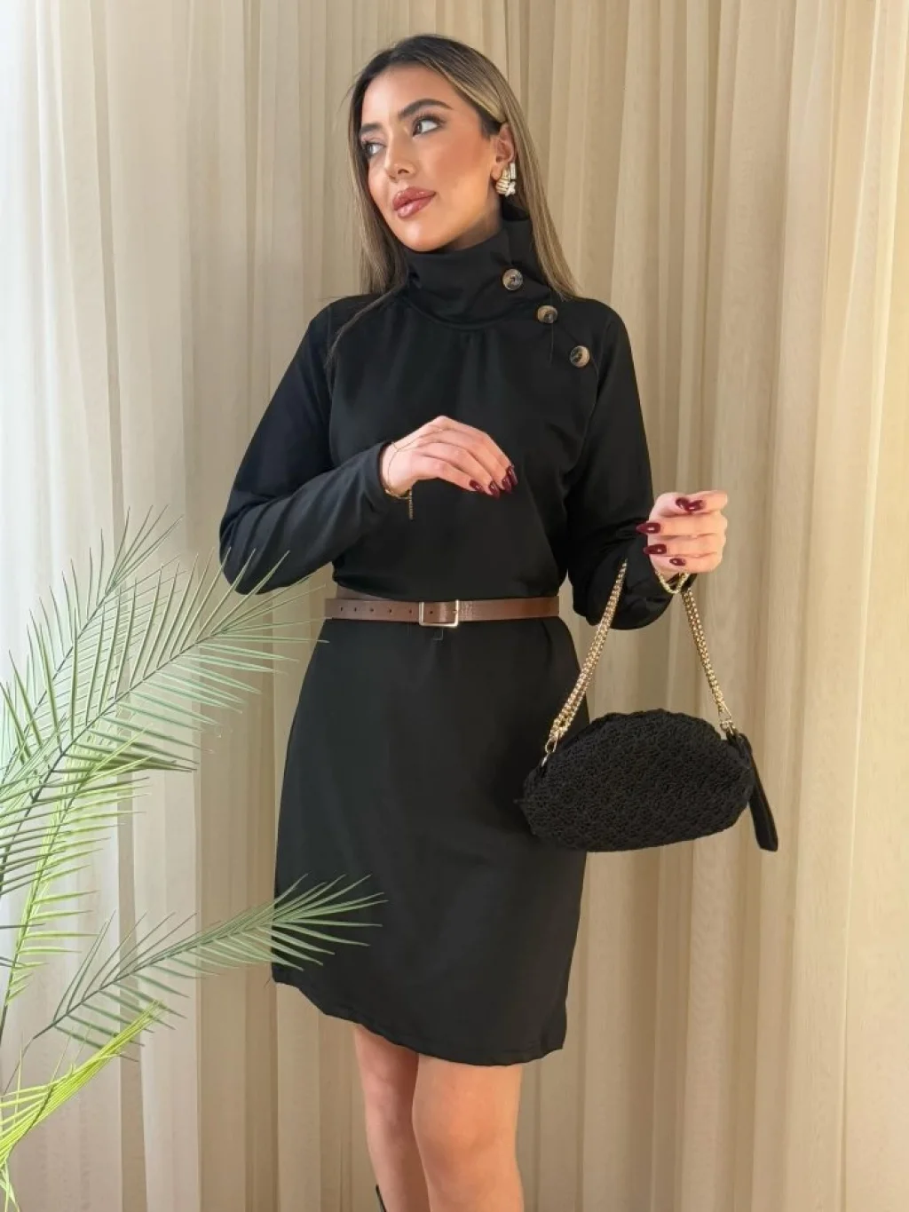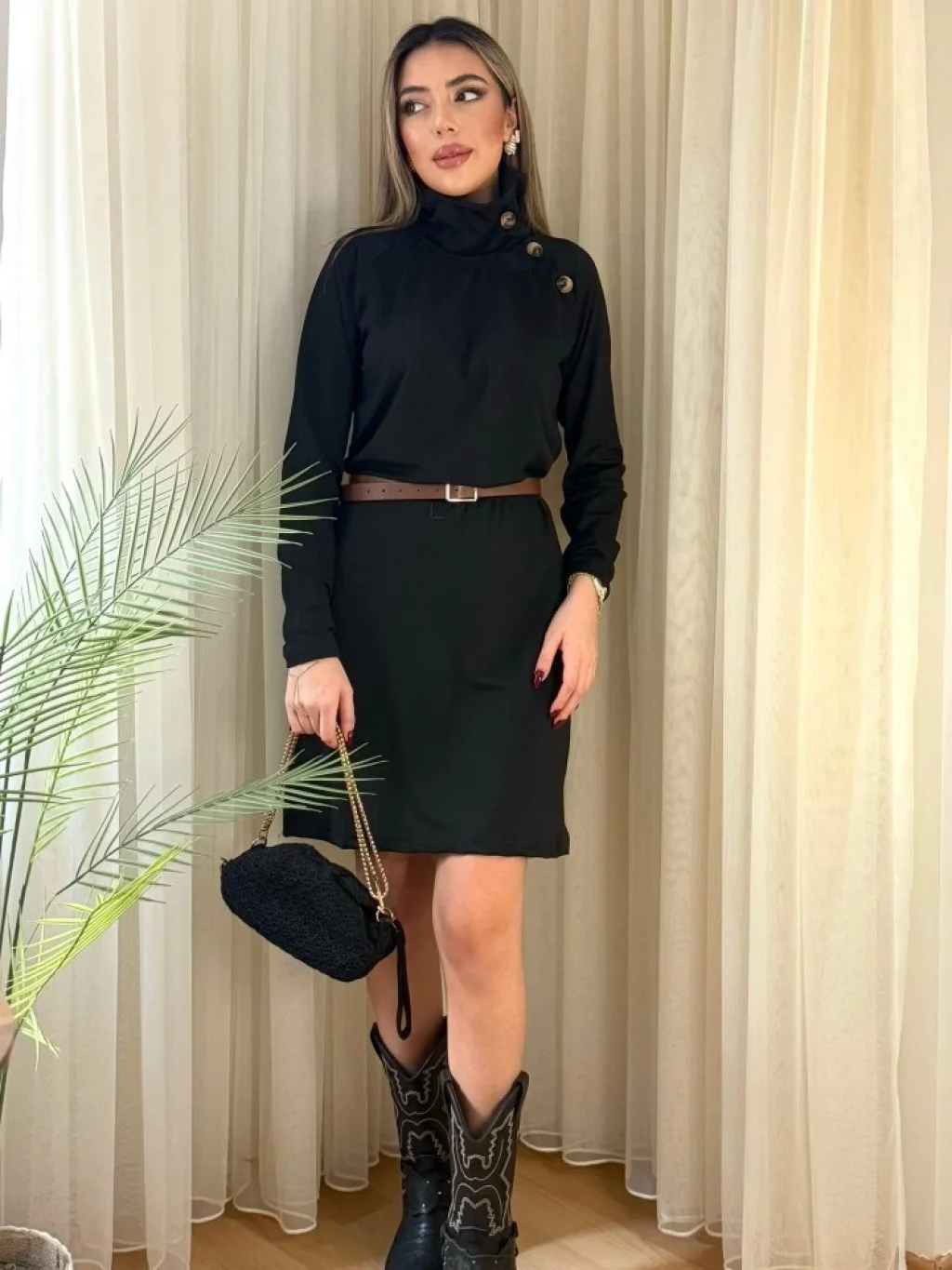 Kadın Uzun Kollu Balıkçı Yaka Düğme Detaylı Kısa şardonlu Dalgıç Elbise