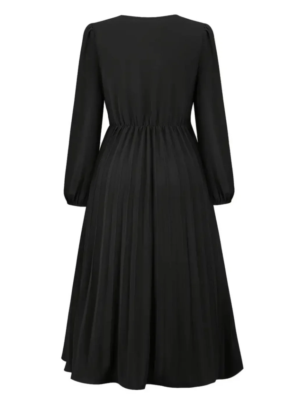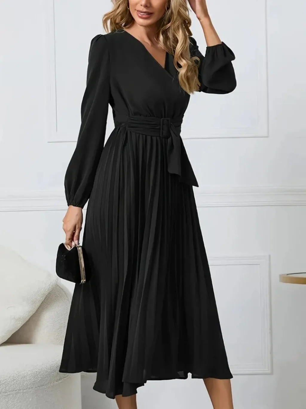 Kadın Uzun Kollu Kruvaze Yaka Belinde Toka Detaylı Pileli Uzun Ithal Krep Elbise