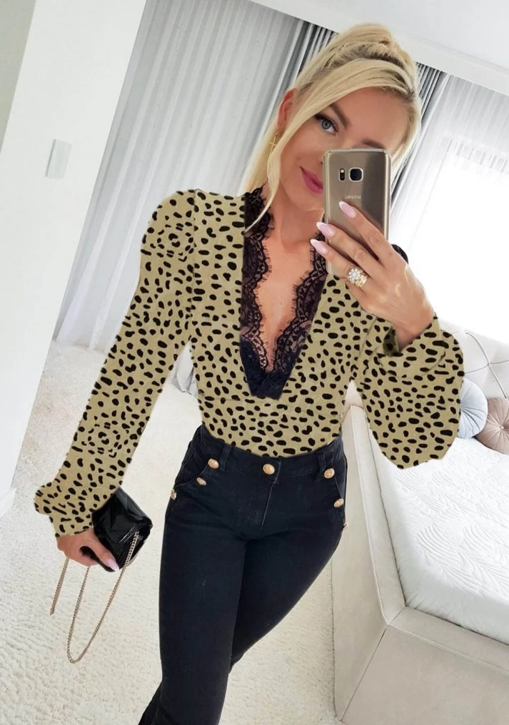 Kadın Uzun Kollu önden Derin Dantel Yaka Leopar Desenli Dalgıç Bluz