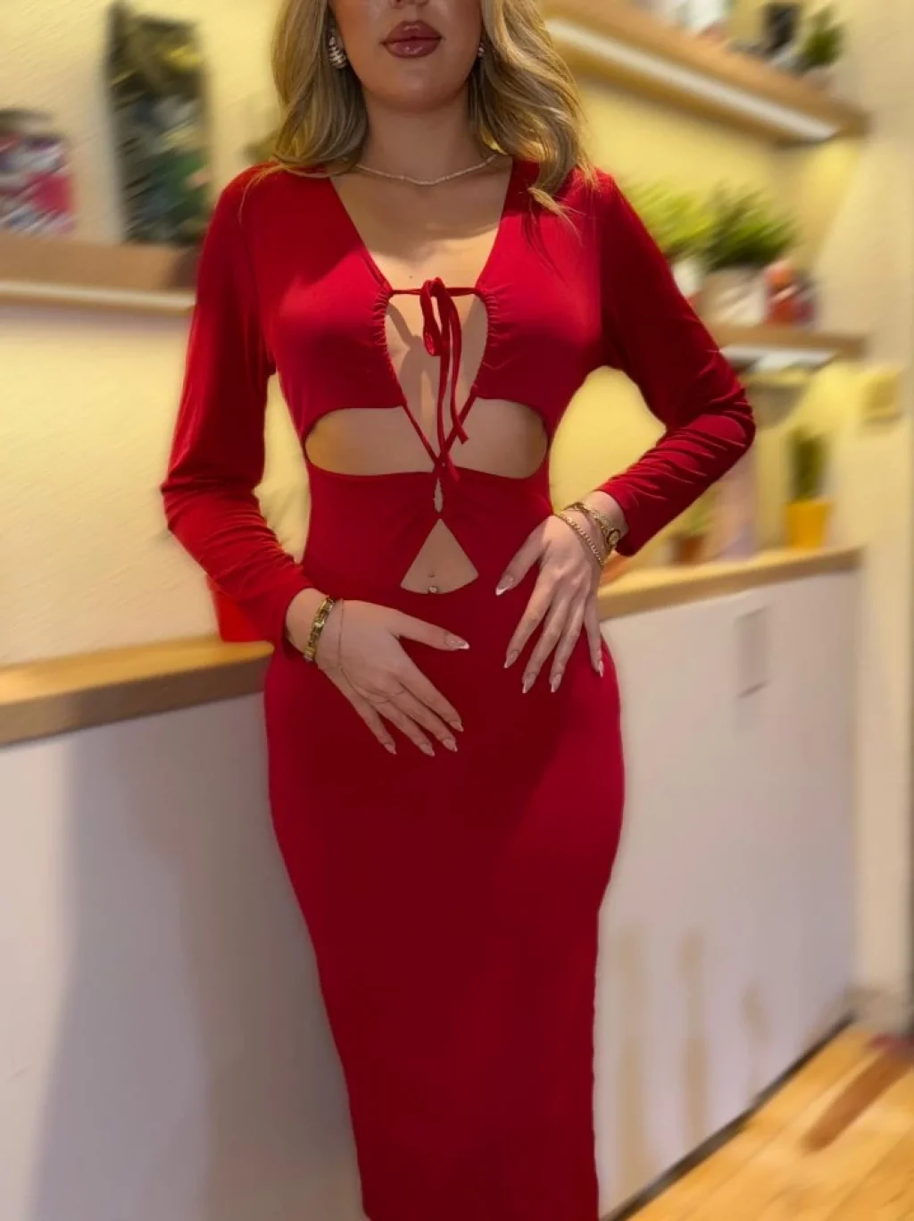Kadın Uzun Kollu Göğüs Ve Göbek Dekolte Detay Sandy Midi Boy Elbise