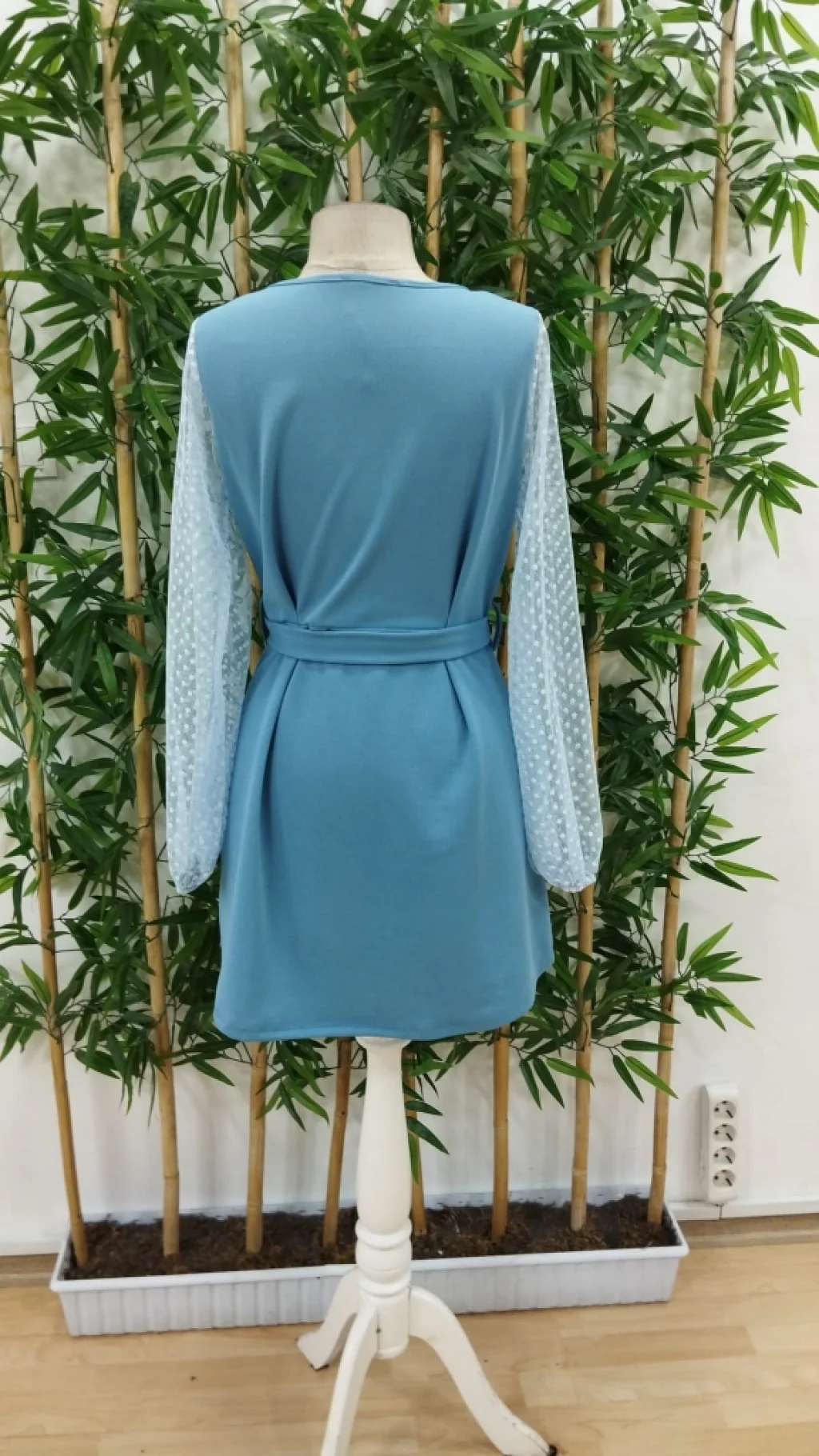 Kadın Uzun Kollu Yakalı Yandan Bağlamalı Mini Desenli Modal Elbise