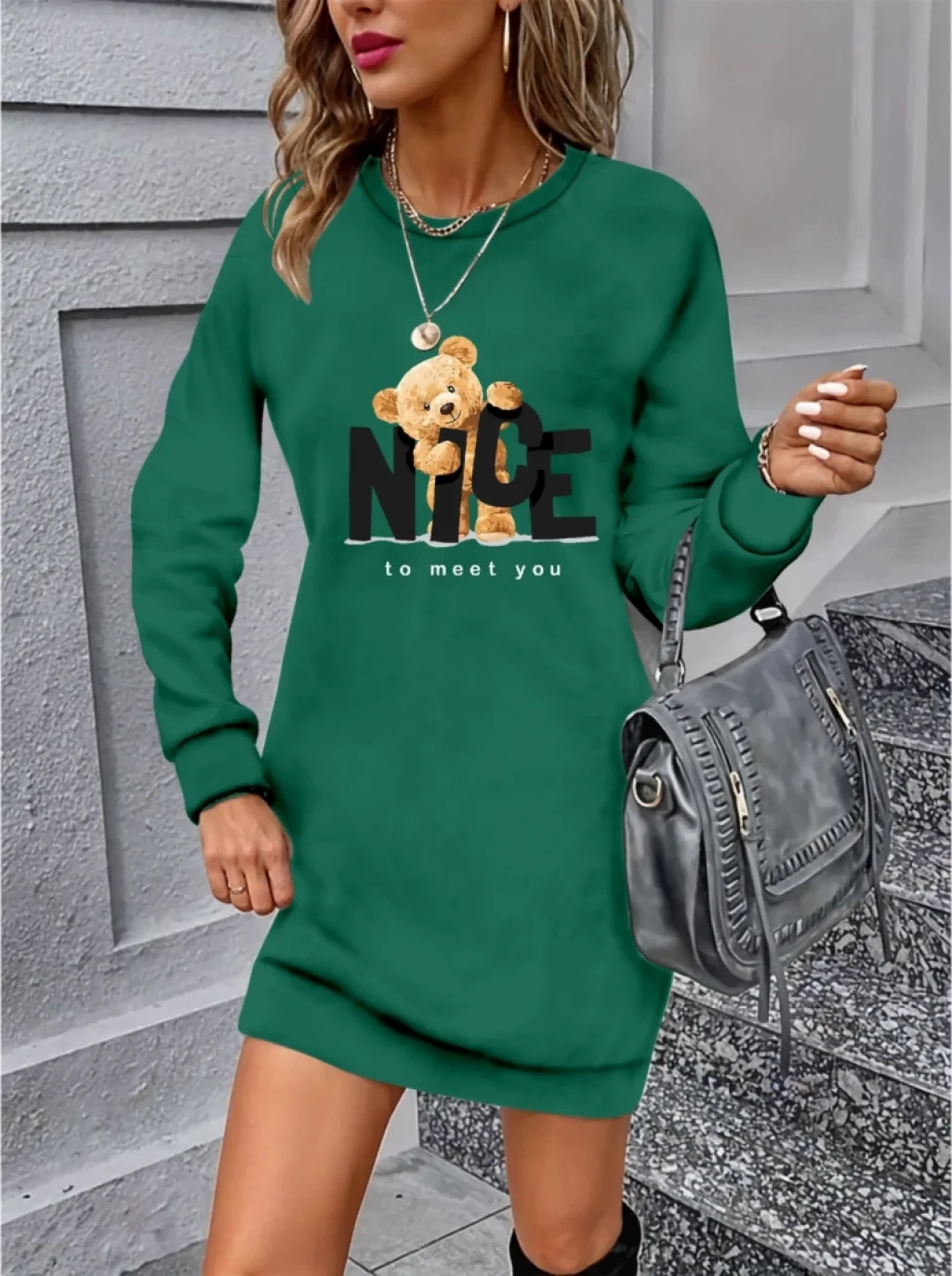 Kadın Uzun Kollu Bisiklet Yaka Ayı Desenli Viskon Iki Iplik Elbise