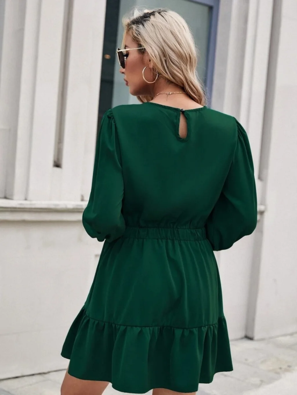 Kadın Uzun Kollu Göğüs Dekolteli Kadife Kumaş Mini Kruvaze Elbise